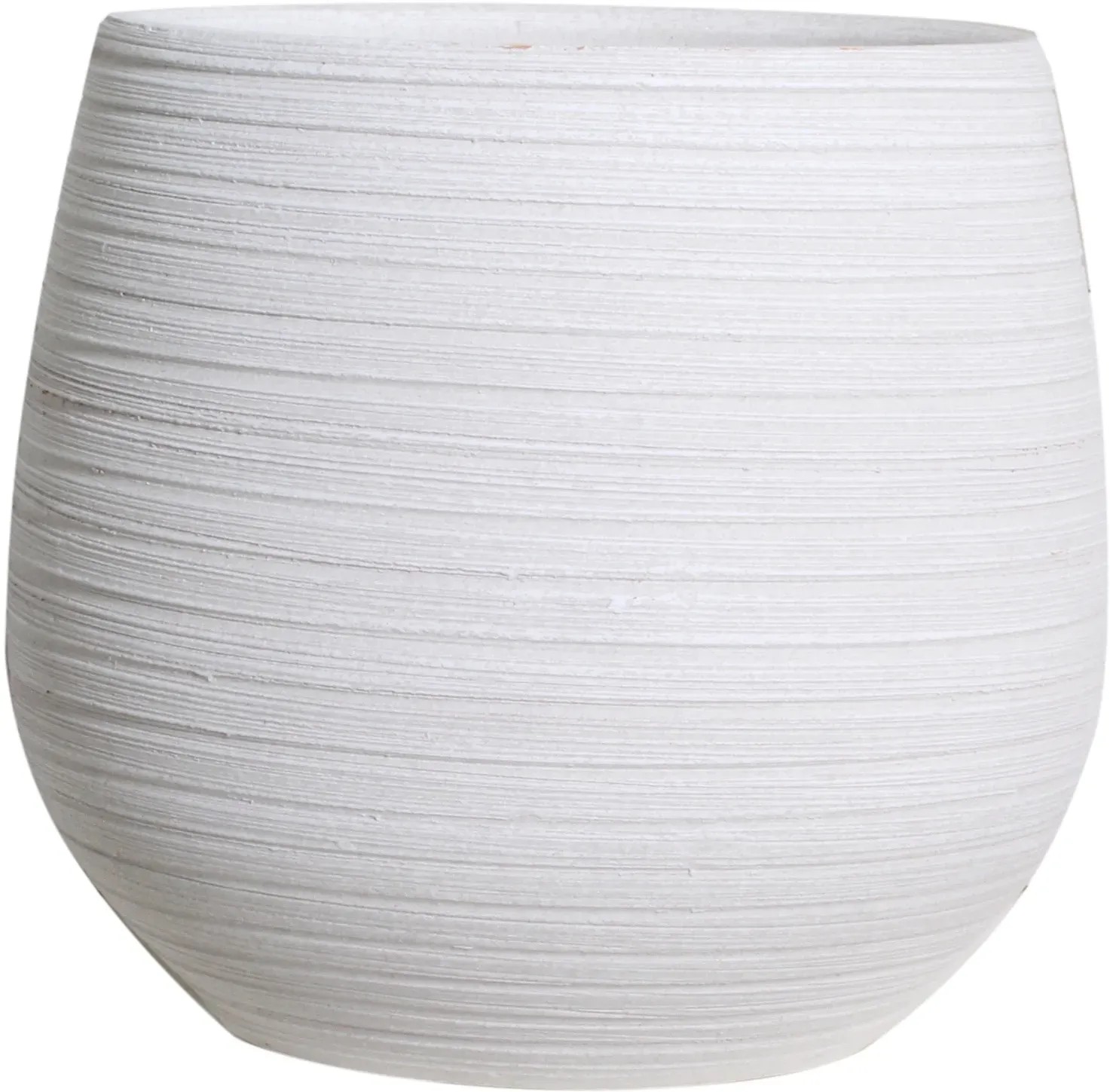 Okrúhly kvetináč s drážkami je trendovou nádobou s prírodným vzhľadom. Je vodotesný a doplnený plstenými podložkami.