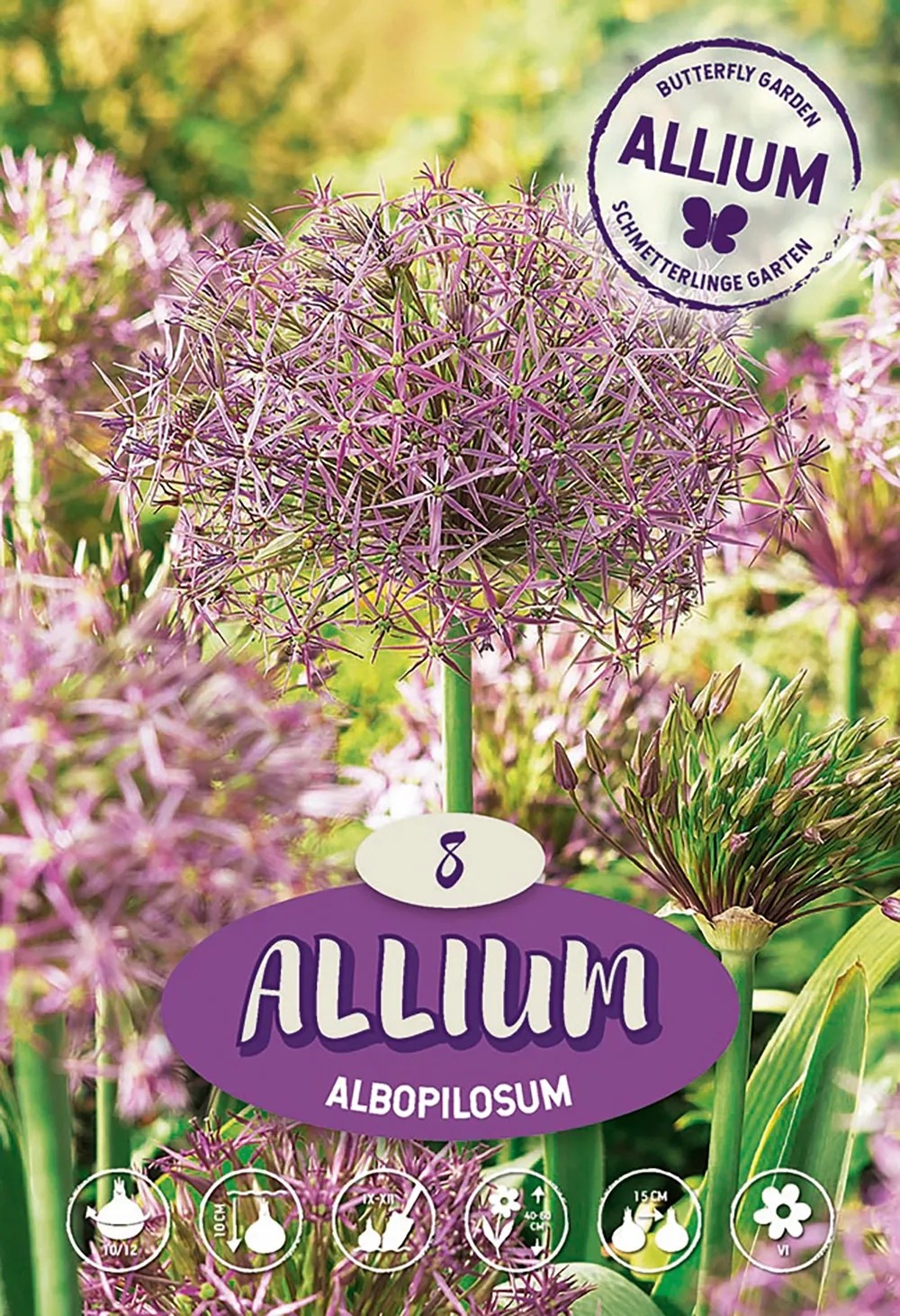 Allium (albopilosum) sú jarné cibuľové kvety, ktoré sú vyslovene nenáročné. Je však dôležité nájsť pre cibuľky kvetov správne stanovište a dobre pripraviť pôdu. Zasadené cibuľové kvety nevyžadujú príliš starostlivosti. Akonáhle vyrašia listy, nesmie byť pôda príliš suchá. Slovenský názov: Okrasný cesnak. Vlastnosti: Vhodné na pestovanie v kvetináči, vhodné na rez, vhodné na divoký rast, potrebujú mierne chrániť pred vetrom, ostatné vlastnosti a pokyny na pestovanie nájdete na obale. Počet na 1 m2: 30.
