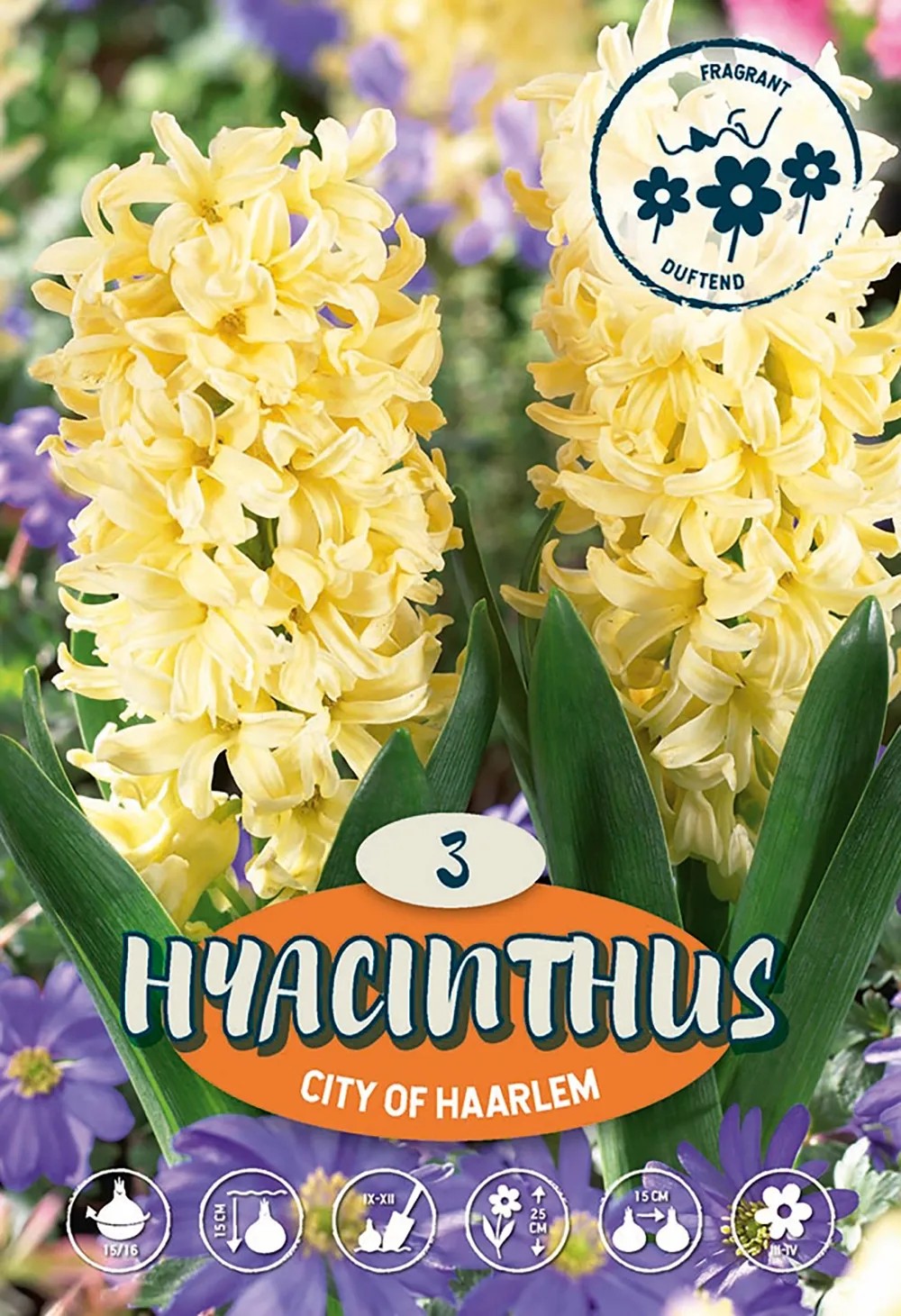 Hyacinty City of Haarlem sú jarné cibuľové kvetiny, ktoré sú vyslovene nenáročné. Je však dôležité nájsť pre cibuľky kvetín správne stanovište a dobre pripraviť pôdu. Zasadené cibuľové kvetiny nevyžadujú príliš veľa starostlivosti. Hneď ako vypučia listy, nesmie byť pôda príliš suchá. Vlastnosti: Vhodné na pestovanie v kvetináči, príjemná vôňa, potrebujú mierne chrániť pred vetrom, ostatné vlastnosti a pokyny na pestovanie nájdete na obale. Počet na 1 m2: 15.