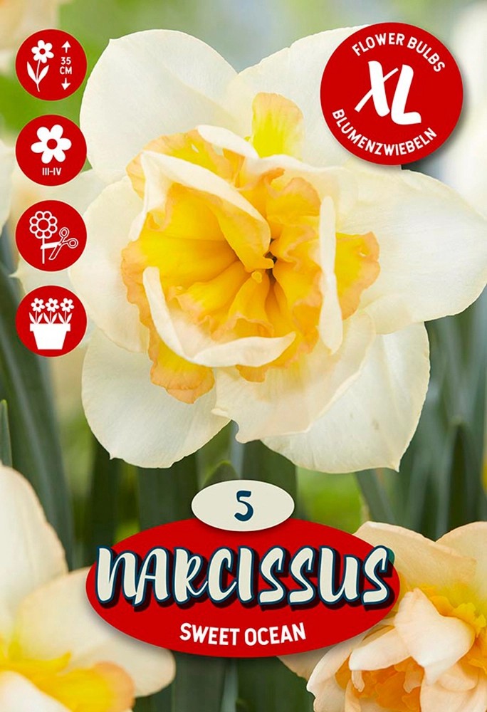 Narcissus Double Sweet Ocean je cibuľka kvety kvitnúce na jar. Mala by sa vysádzať na jeseň do jamky hlbokej 10 cm. Pôda by mala byť dobre priepustná pre vodu, tak ako u všetkých cibuliek. Na jar si potom budete môcť vychutnávať krásu kvetov.