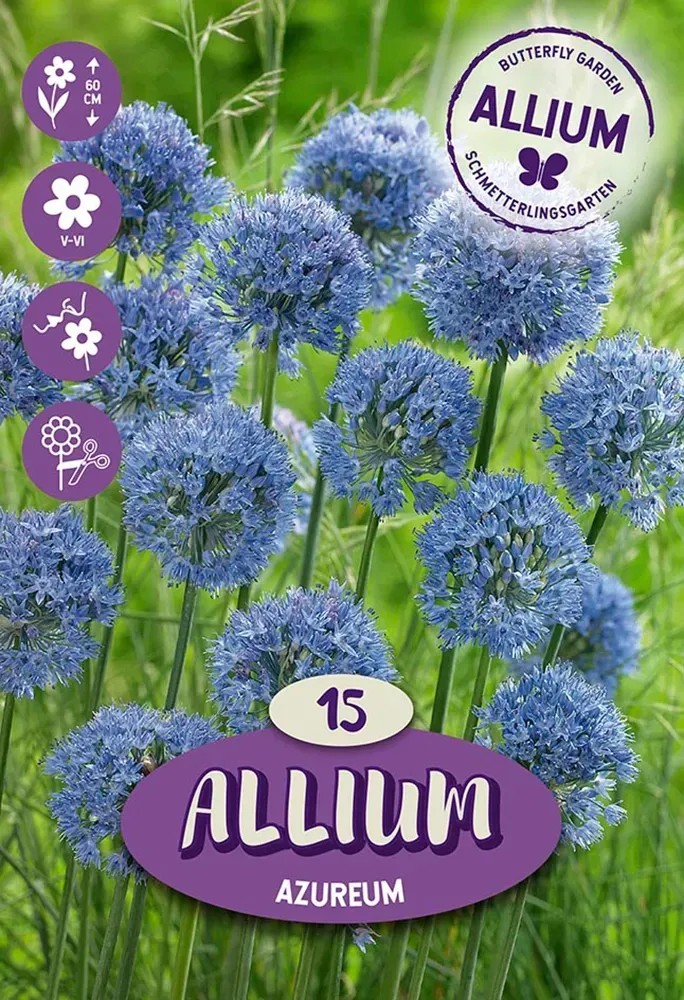 Cesnak (Allium) "Azureum" je vhodný do záhrady aj do výsadbových nádob. Cibuľky sa vsádzajú na jeseň do dier hlbokých cca 10 cm. Cesnak dorastá do výšky 60 cm, kvitne máj až jún. Príjemne vonia a priťahuje motýle.