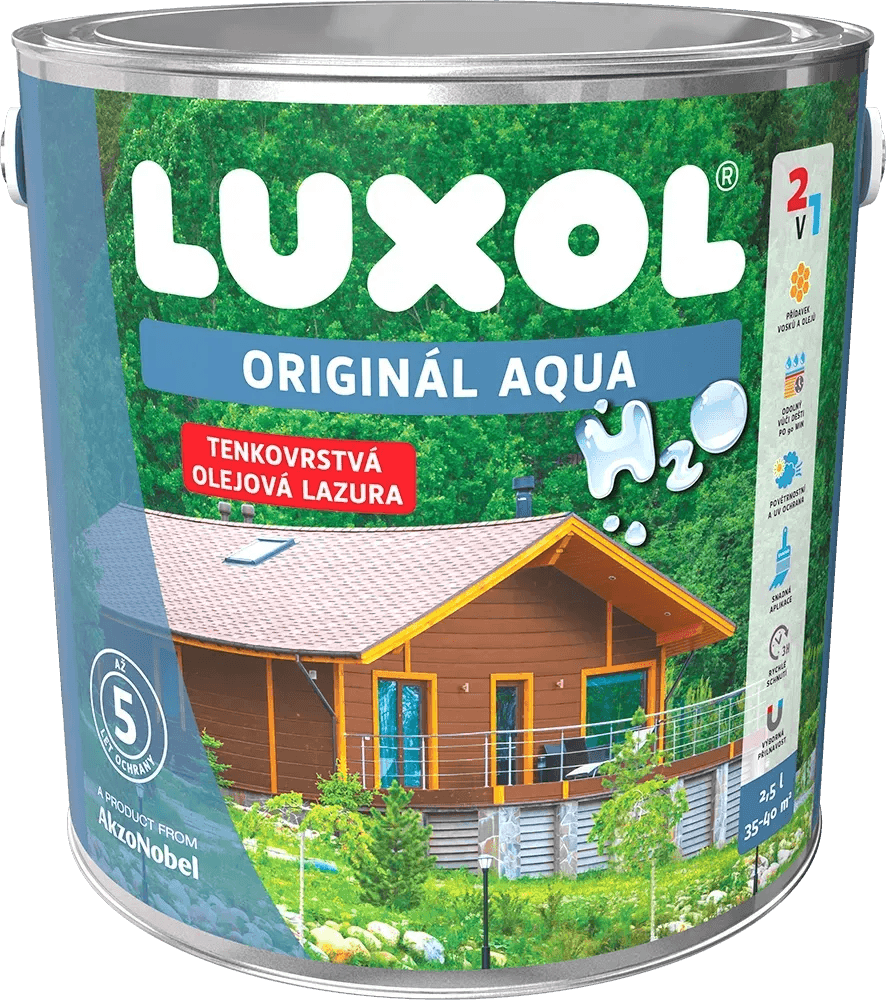 LUXOL Originál AQUA je tenkovrstvová olejová lazúra na vodnej báze na dekoratívne nátery na drevo s ochranou proti poveternostným vplyvom a UV žiareniu. Rýchloschnúca receptúra má vylepšené vlastnosti ako zvýšenú vodoodpudivosť, vysokú priľnavosť ďalšieho náteru, mechanickú odolnosť a tiež hlbokú penetráciu. Ponúka preventívnu biocídnu ochranu produktu proti plesniam. Po 20 minútach je náter odolný voči prachu a po 90 minútach voči dažďu. Vďaka novej krémovej konzistencii sa lepšie rozotiera a jednoducho aplikuje. Lazúra vyniká stálymi farebnými odtieňmi s matne saténovým vzhľadom. Náter neobmedzuje dýchanie dreva a vďaka zníženému obsahu VOC je tiež šetrnejší k životnému prostrediu.