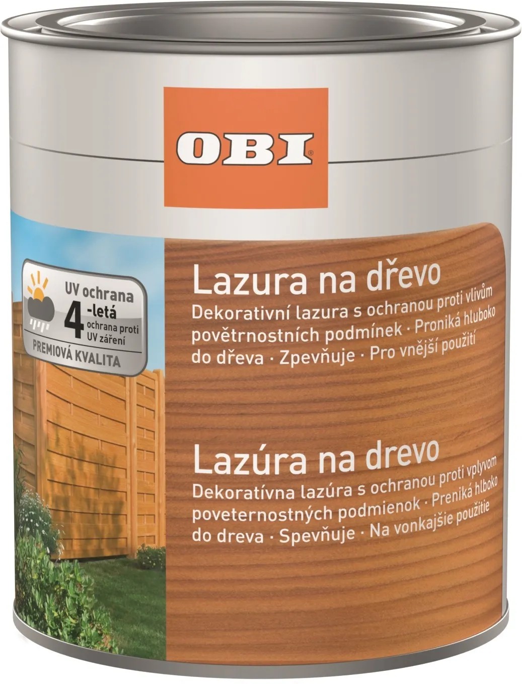 OBI Lazúra na drevoTenkovrstvová lazúra OBI s obsahom rozpúšťadiel na drevené stavebné diely v exteriéri (ako napr. ploty, pergoly, zásteny), ktorá sa vsiakne hlboko do podkladu. Zvýrazňuje kresbu dreva, chráni ho pred poveternostnými vplyvmi a stará sa oň. Nevhodná na náter podláh.