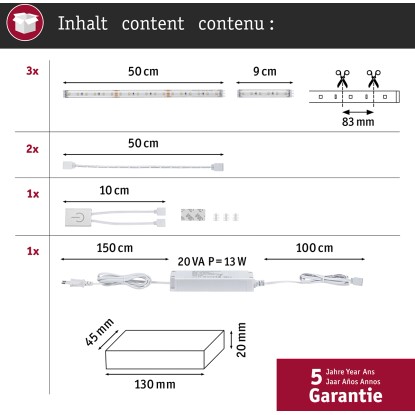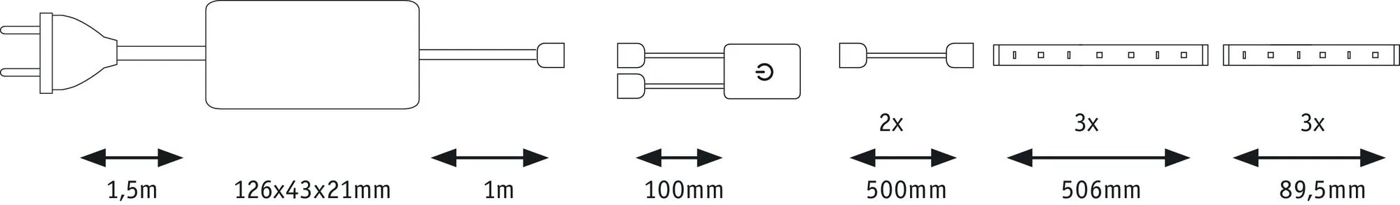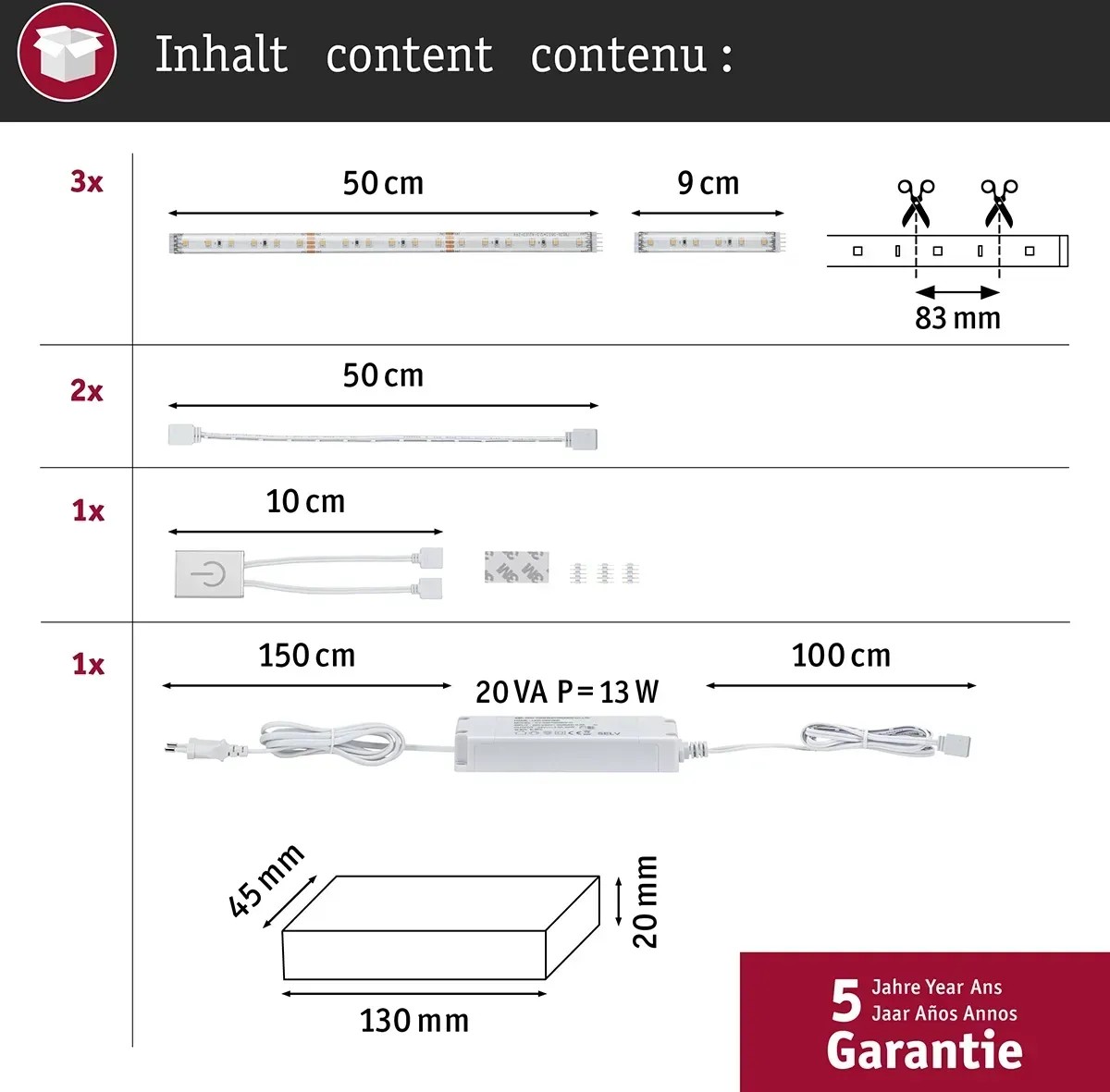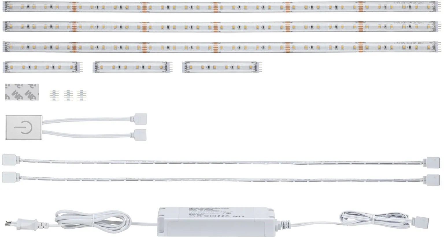 Súprava poskytuje perfektné pracovné svetlo pod kuchynskou skrinkou. Tri pásiky s povrchovou úpravou sú navrhnuté pre 3 závesné skrinky s dĺžkou 60 cm. Ak je to potrebné, môžete pásiky skrátiť každých 8 cm alebo predĺžiť pomocou prídavného pásika až na 3 m. Súprava je vybavená dlhým prívodným káblom a dva dodatočné káble umožňujú pokládku za digestorom. Pomocou filigránskeho dotykového spínača vrát. regulátora jasu môžete svetlo zapnúť a vypnúť priamo na spodnej skrinke. Pri jednoduchom dotyku na elegantné kovové teleso spínača zapnete/vypnete svetlo a pri dlhšom stlačení a podržaní môžete plynule regulovať jas.