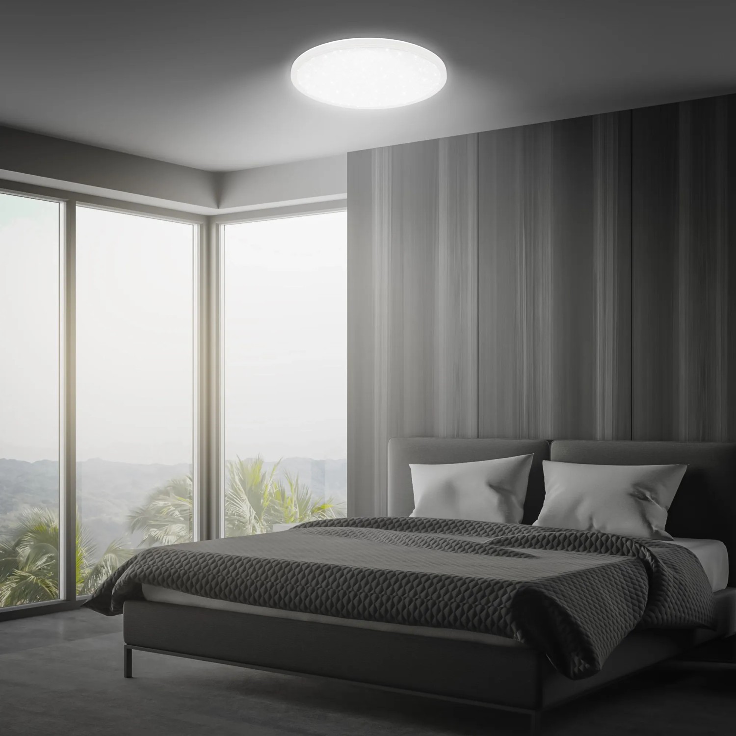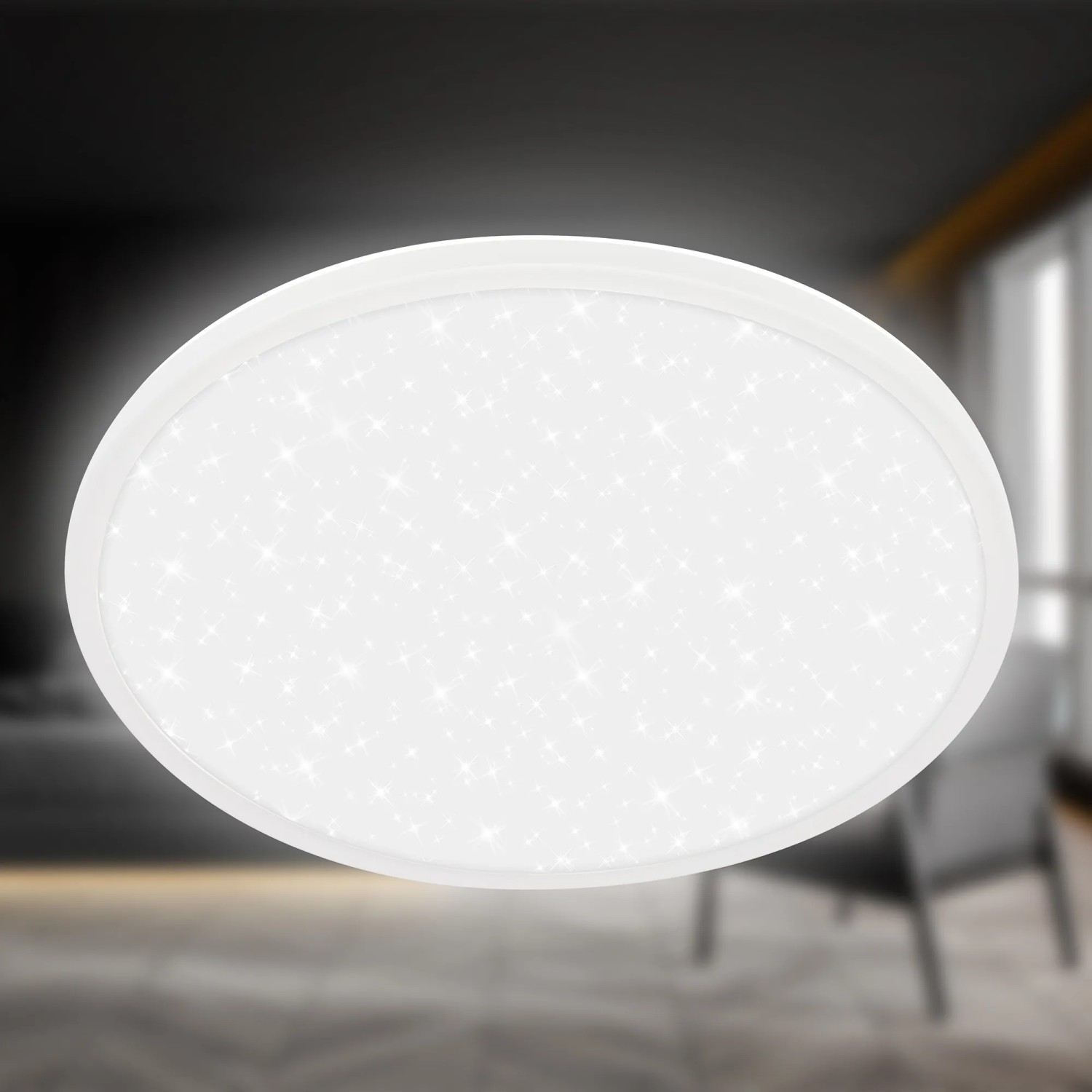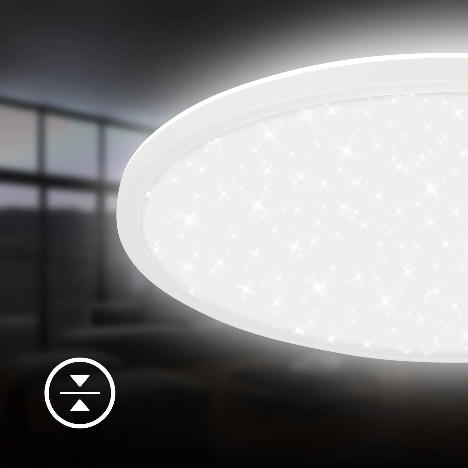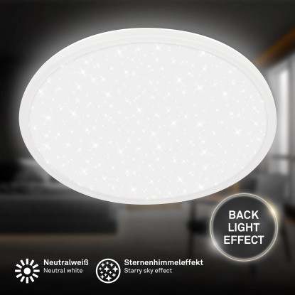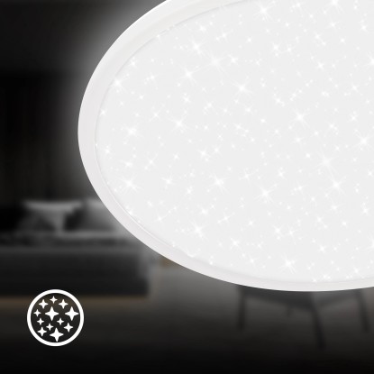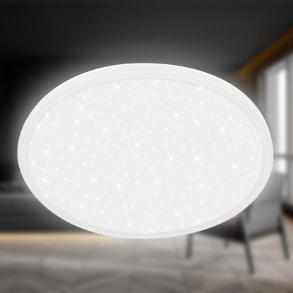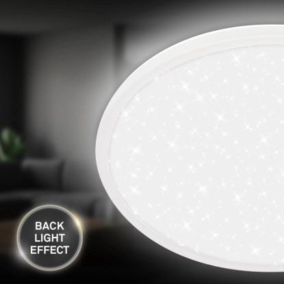 Toto moderné LED svietidlo kombinuje tenký dizajn s elegantným hviezdnym efektom a je ideálny pre obývacie izby, spálne alebo chodby. Svietidlo má nízkou výškou 3,3 cm a priemer 37,5 cm. Disponuje výkonom 30 W so svetelným tokom 3600 lm a teplotou chromatičnosti 4000 K, ktorá zodpovedá neutrálnej bielej farbe svetla. Svietidlo disponuje efektom hviezdneho neba.