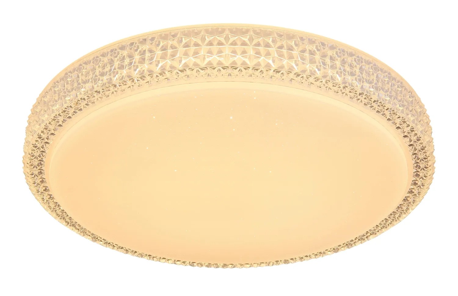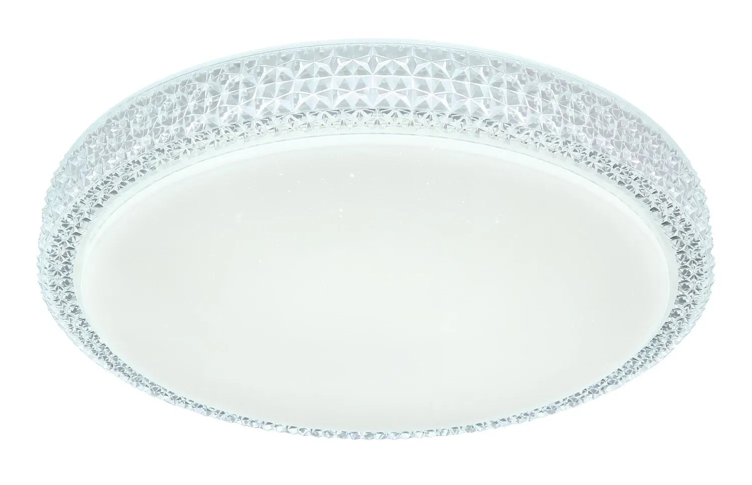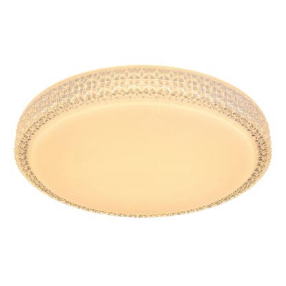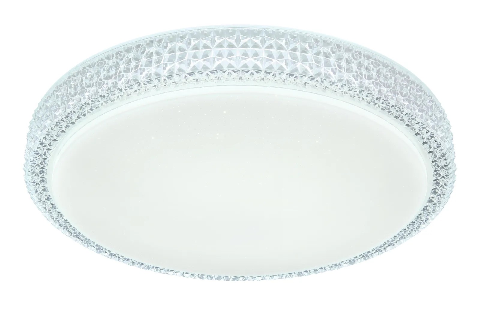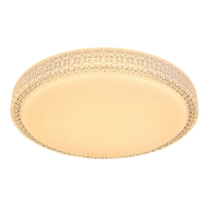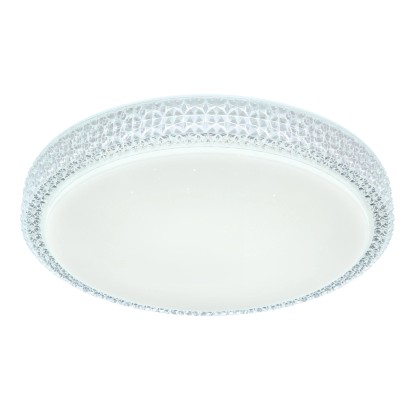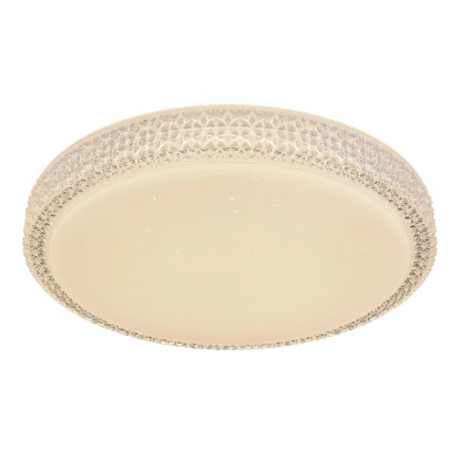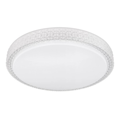 Stropné svietidlo Globo Ovi s priemerom 400 mm s výškou 85 mm. Svietidlo je vyrobené z kovu a akrylu, opatrené priehľadnými plastovými kryštálikmi. Svietidlo má nastaviteľnú farbu svetla 3000, 4500 a 6500 K pomocou nástenného vypínača. S trblietavým efektom.