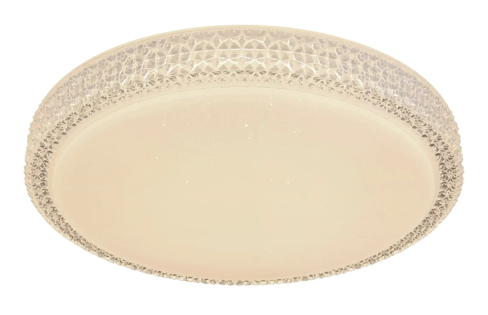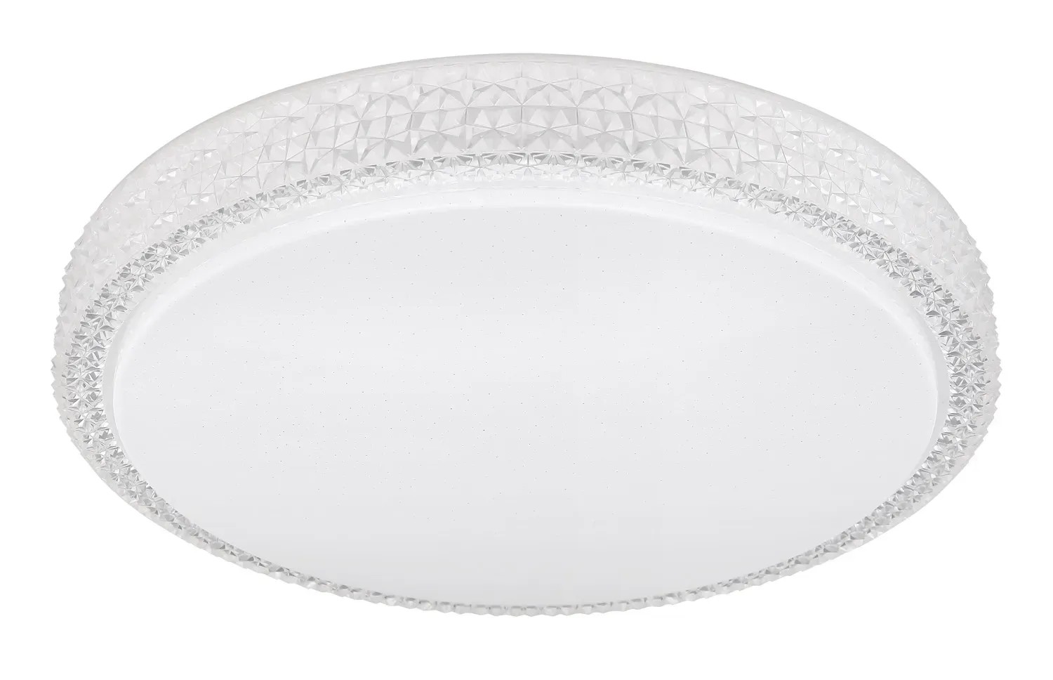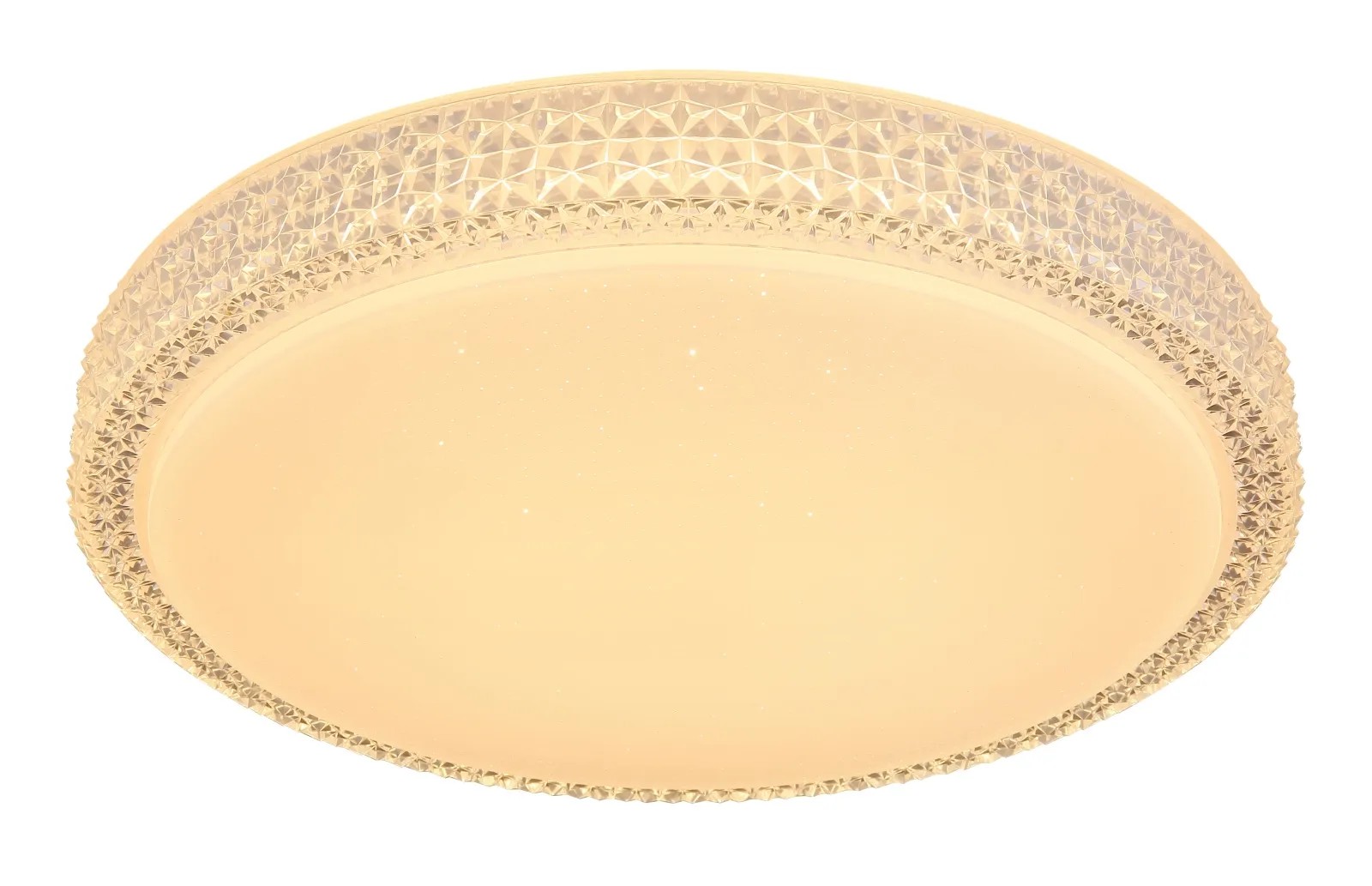 Stropné svietidlo Globo Ovi s priemerom 400 mm s výškou 85 mm. Svietidlo je vyrobené z kovu a akrylu, opatrené priehľadnými plastovými kryštálikmi. Svietidlo má nastaviteľnú farbu svetla 3000, 4500 a 6500 K pomocou nástenného vypínača. S trblietavým efektom.