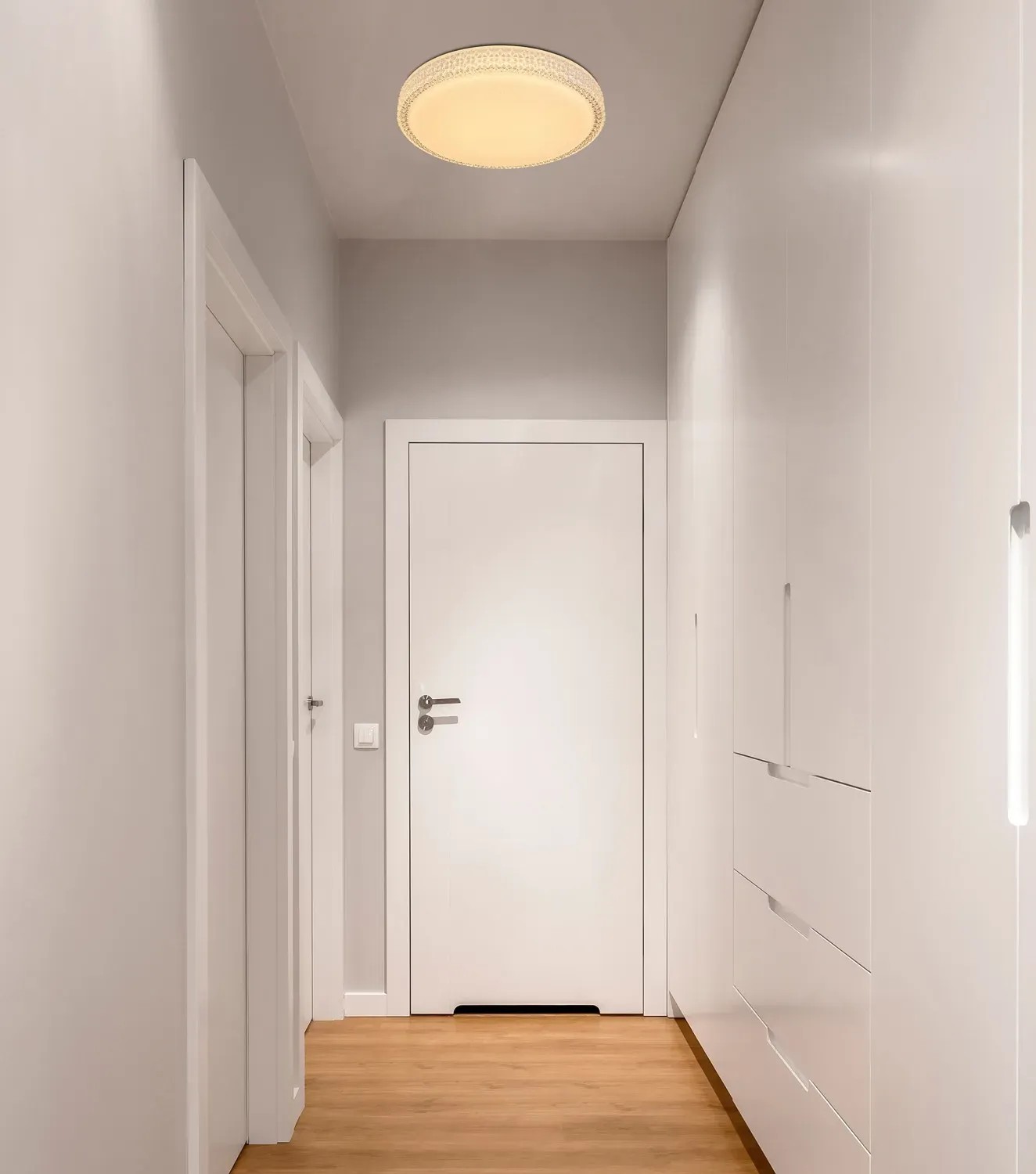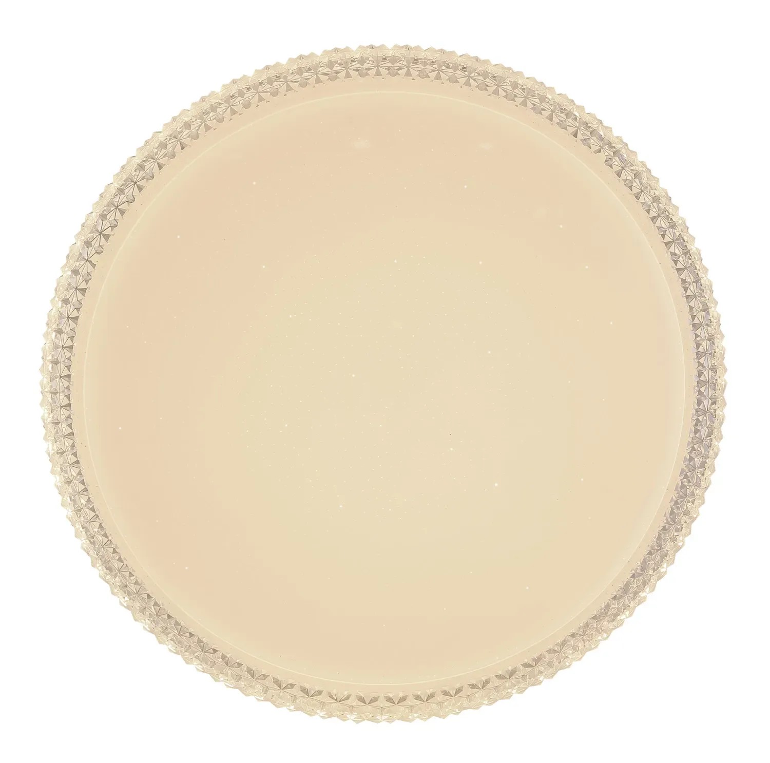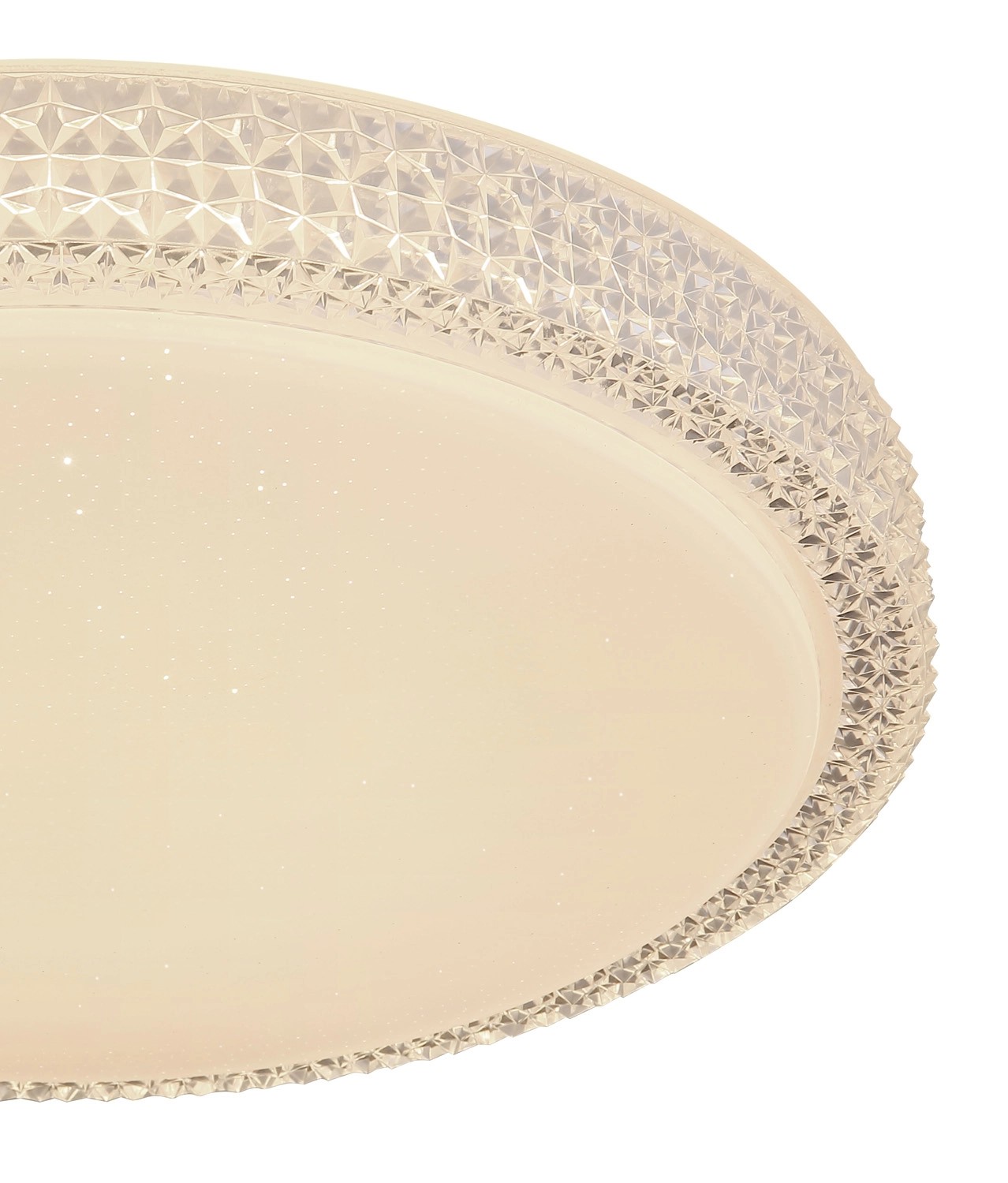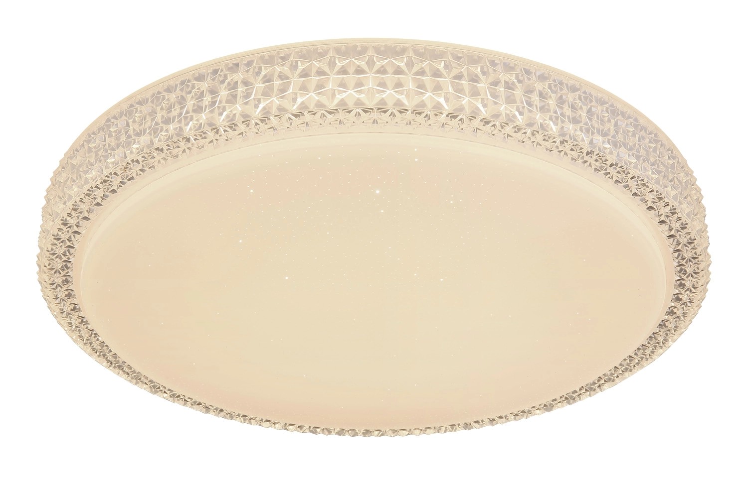 Stropné svietidlo Globo Ovi s priemerom 400 mm s výškou 85 mm. Svietidlo je vyrobené z kovu a akrylu, opatrené priehľadnými plastovými kryštálikmi. Svietidlo má nastaviteľnú farbu svetla 3000, 4500 a 6500 K pomocou nástenného vypínača. S trblietavým efektom.