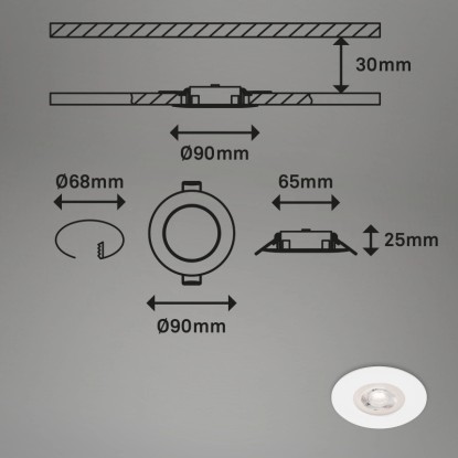Brilo vstavané bodové stmievateľné LED svietidlo bielej farby zo série Kulana má pevne zabudovaný LED panel s výkonom 4,9 W a svetelným tokom 480 lumenov. Svietidlo má teplú bielu farbu svetla (3000 K) a jeho jas je možné postupne regulovať pomocou bežného nástenného spínača. Vďaka stupňu krytia IP44 je chránené proti striekajúcej vode, a preto sa hodí aj do kúpeľne. Vstavané svietidlo sa dodáva v praktickej sade štyroch kusov. Montážny rozmer má priemer 6,8 cm a montážnu výšku 3 cm. Svietidlo má rozmery 9 x 2,5 cm (pr. x V).