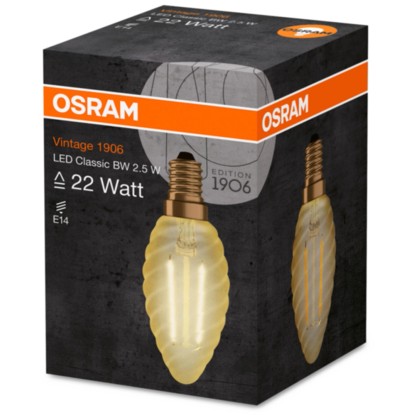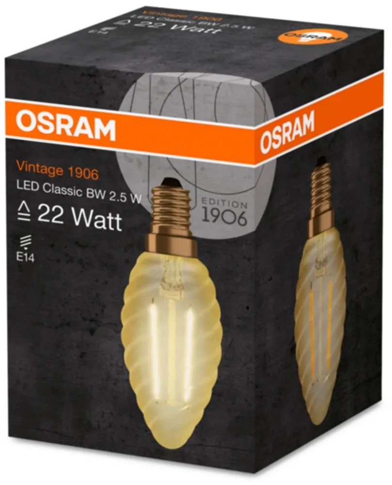 Praktická LED žiarovka Osram v tvare krútenej sviečky s päticou E14 sa vyznačuje dlhou životnosťou až 15 000 hodín. Edícia 1906 vdychuje historickému tvaru žiarovky nový život - pomocou novej technológie svetla. Žiarovka vytvorí okamžite 100% svetla bez oneskorenia pri nábehu.