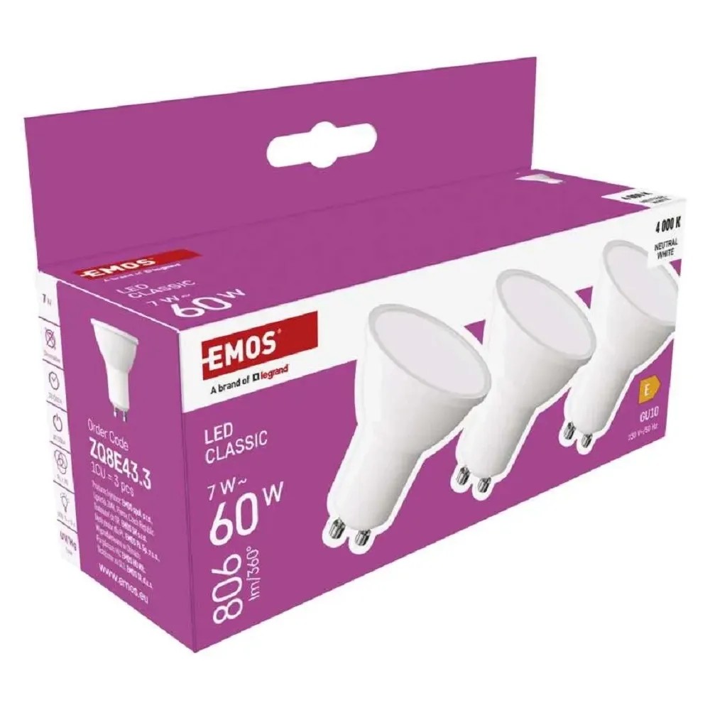 Emos LED žiarovka Classic MR16, GU10, 7W (60W), 806lm, 4000K, pr. 5 x 5,8cm, 3ks