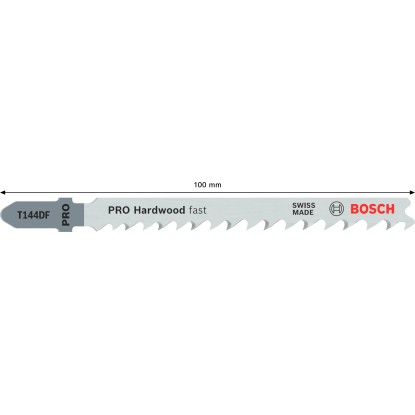 Pílový list Bosch T 144 DF na tvrdé drevo umožňuje rýchle a rovné rezy v dreve. Ostro brúsené zuby sú rozvedené, čo umožňuje rýchle rezy. Ozubený pás vyrobený z kalenej HSS (rýchloreznej ocele) a BIM (bimetalu) je vystužený vysoko elastickou HCS (uhlíkovou oceľou), vďaka čomu je list vhodný na rezanie tvrdých materiálov, ako je tvrdé drevo a abrazívne drevené materiály.