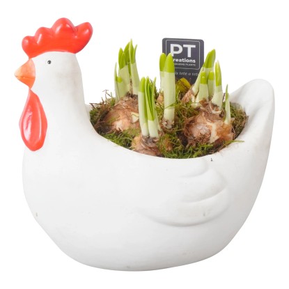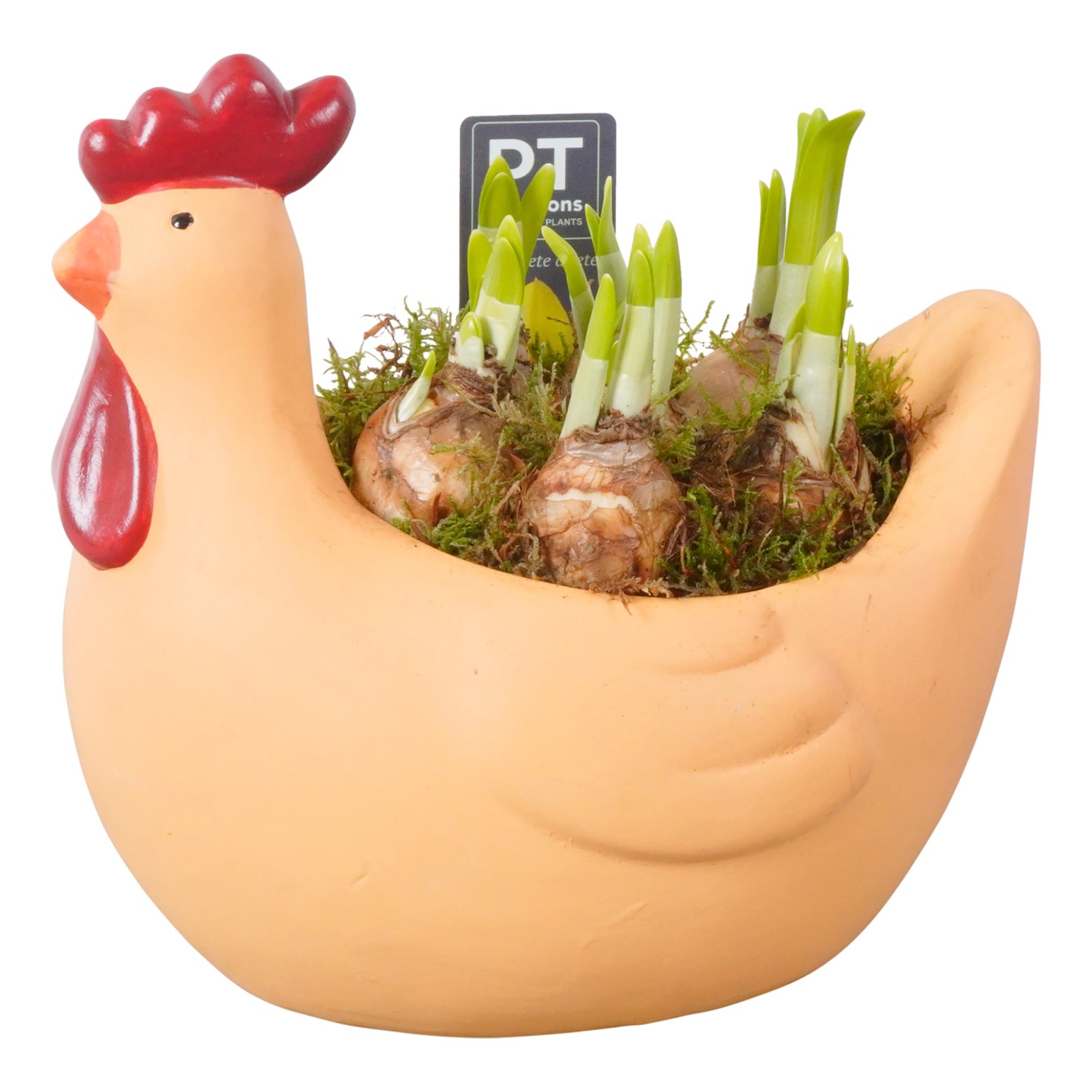 Aranžmán narcisov v kvetináči v tvare sliepky, 2 farby, pr. kv. cca 21 cm