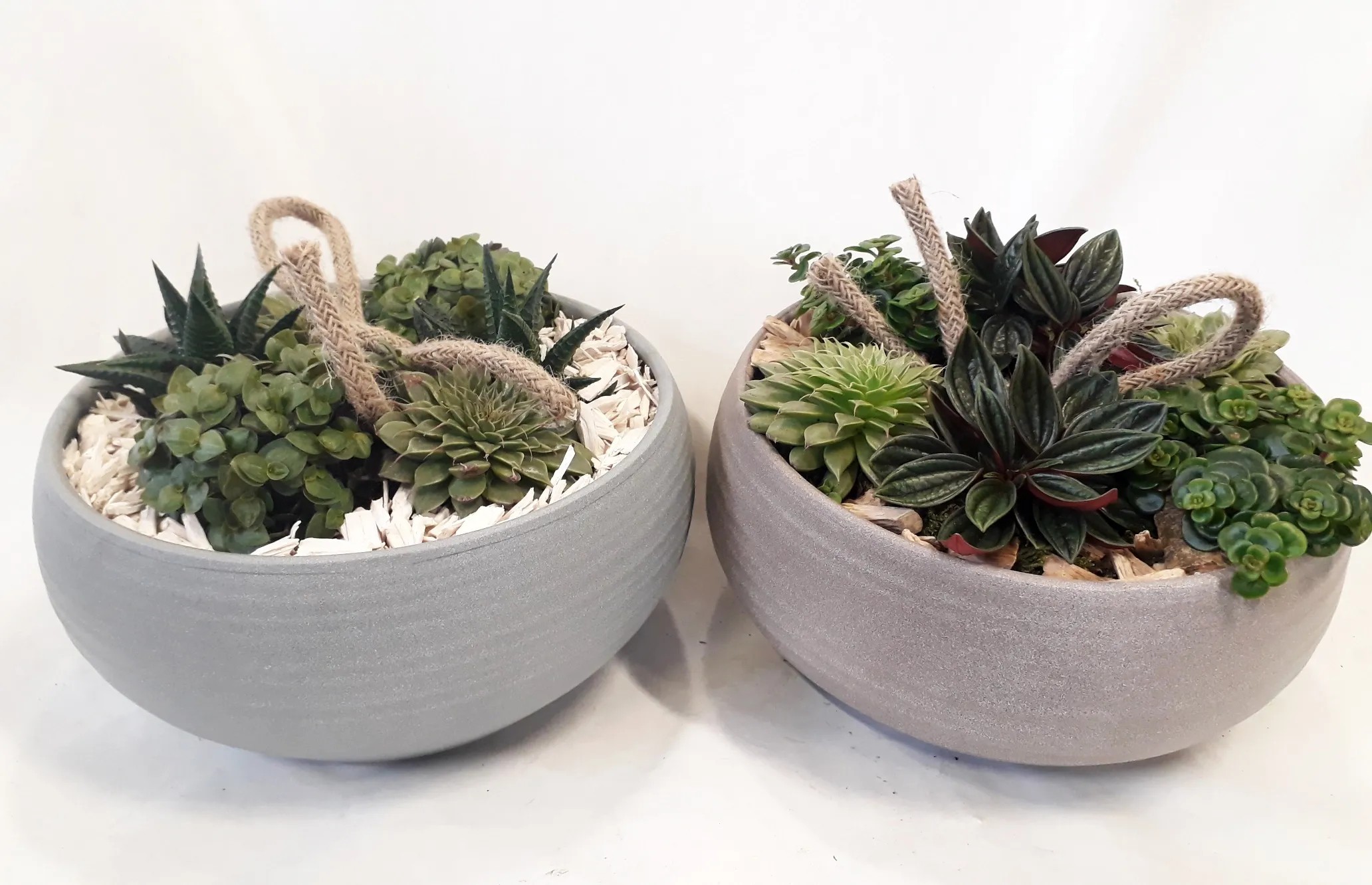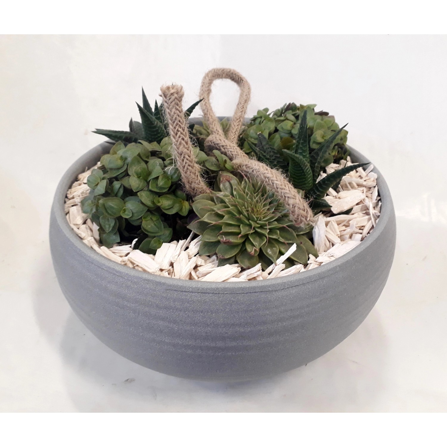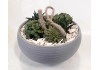 Tento krásny aranžmán s výberom obľúbených rastlín s okrasnými listami, ktoré sú nenáročné na pestovanie, ako pieprovec (Peperomia), echevéria (Echeveria), tučnolist (Crassula) a haworthia (Haworthia), vytvára prírodný nádych. Kontrast rôznych farieb a štruktúr listov vytvára spolu s dekoratívnymi prvkami živý obraz.