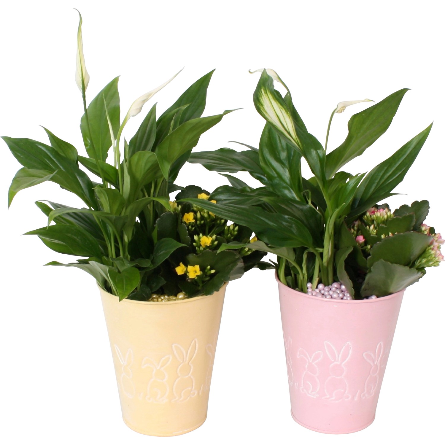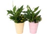 Kalanchoe Blossfeldova (Kalanchoe) a lopatkovec (Spathiphyllum) zaručujú dlhú trvanlivosť aranžmánu a predovšetkým brečtan popínavý prispeje svojimi vlastnosťami k čisteniu vzduchu v miestnosti. Rastliny uprednostňujú izbovú teplotu a svetlé miesto bez priameho poludňajšieho slnka. Pri pravidelnom polievaní vám budú radosť prinášať dlho.