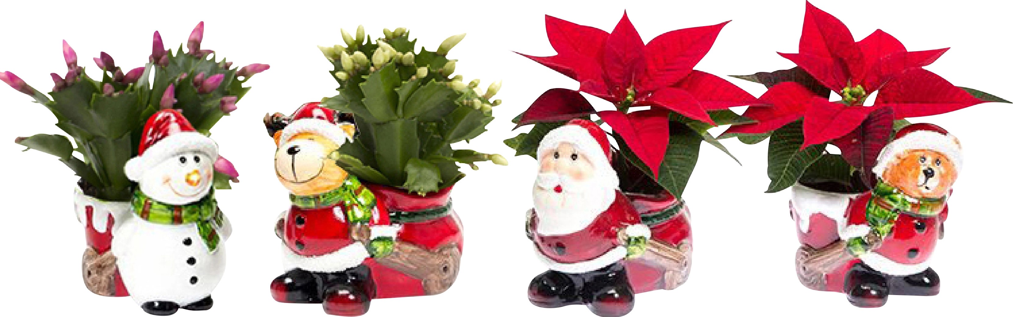 V týchto originálnych malých keramických kvetináčoch je vysadená buď vianočná ruža (Euphorbia), alebo vianočný kaktus (Schlumbergera). Obe rastliny sú obľúbené v čase adventu a vnášajú do domu farby. Tieto vianočné aranžmány sa výborne hodia aj ako stolové dekorácie napr. pri vianočných oslavách.