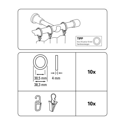 Krúžky s háčikmi a sponami sú ideálnym doplnením záclonových súprav Európa 19 mm. Sú k dispozícii v rôznych farebných prevedeniach.