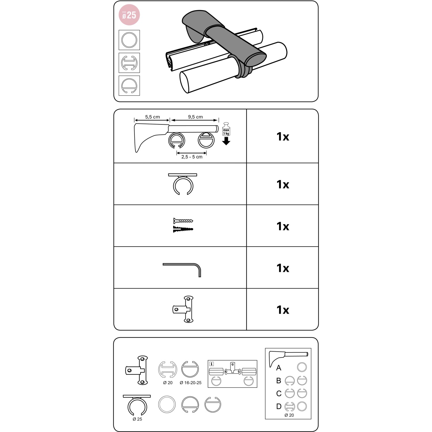 Nosník je vyrobený z robustného kovu a je použiteľný na jednotlivý sortiment zo série Windsor. Každý nosník sa dodáva s krúžkovým adaptérom na záclonové tyče a krížovým adaptérom na záclonové tyče s drážkou. Univerzálny nosník je použiteľný na dekorácie s 1 a 2 tyčami a rozstupy medzi 1. a 2. tyčou sa dajú ľubovoľne nastaviť.