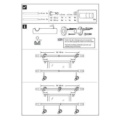 Záclonová súprava Gardinia Zylinder zaujme svojim jednoduchým a elegantným vzhľadom, flexibilitou a praktickosťou. Súčasťou je všetok montážny materiál potrebný na upevnenie. Súčasťou balenia je 1 x nastaviteľná záclonová tyč pr. 22/25 mm, 100-190 cm, 2 x nástenný držiak, 2 x koncovka, 6 x skrutka + hmoždinka.