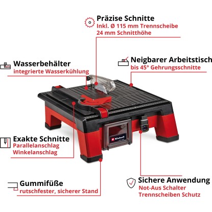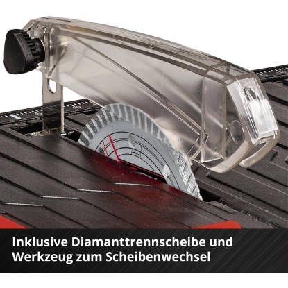 Dostatočné chladenie pílového listu pri rezaní zaisťuje integrovaná nádrž na vodu, ochrana rezných kotúčov ponúka potrebnú bezpečnosť. Protišmykové gumové nožičky bez vibrácií zaručujú stabilitu. Možnosť uchopenia zaručuje mobilitu ľahkej akumulátorovej rezačky dlaždíc. Súčasťou dodávky je diamantový rezný kotúč a nástroj.