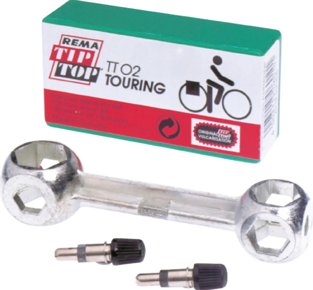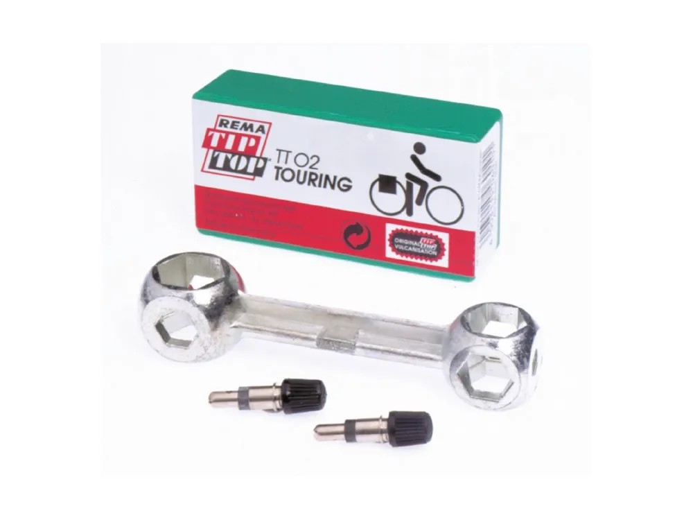 Súprava na opravy Tip-Top obsahuje 1 x súpravu na lepenie defektov Tip-Top TT 02, 2 patentové ventily a 1 hlavový kľúč.