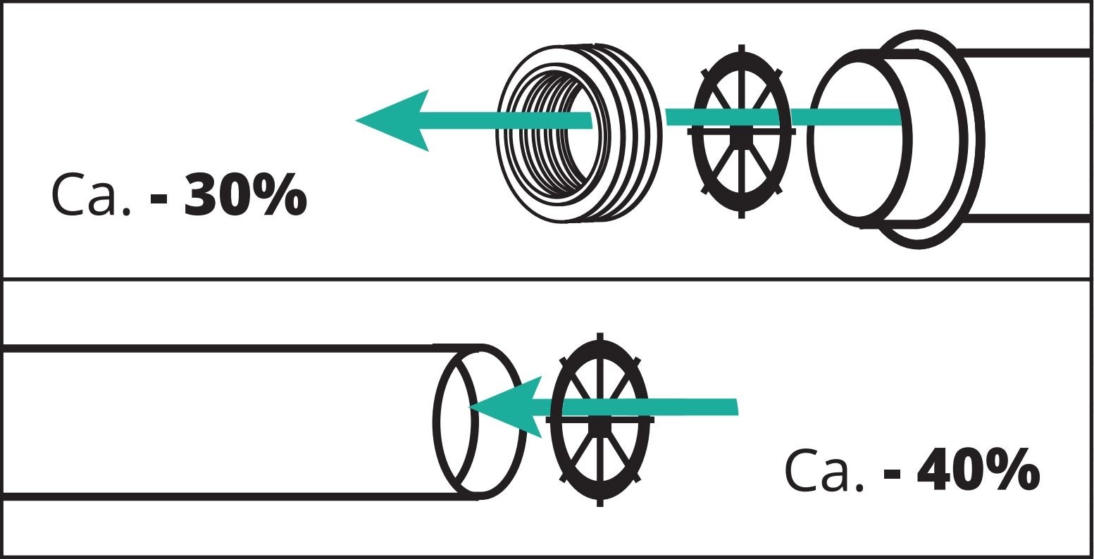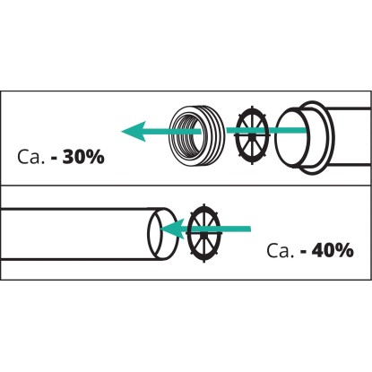 Regulácia vody pre vašu toaletuV závislosti na požadovanom znížení vody môžete regulátor splachovania nainštalovať buď na stranu smerujúcu k nádržke alebo k toalete. Pri montáži na splachovaciu nádržku sa prietok splachovania zníži o 40 %, zatiaľ čo montáž na toaletu umožňuje zníženie o 30 %. Môžete sa teda sami rozhodnúť, koľko vody sa spotrebuje pri každom spláchnutí.