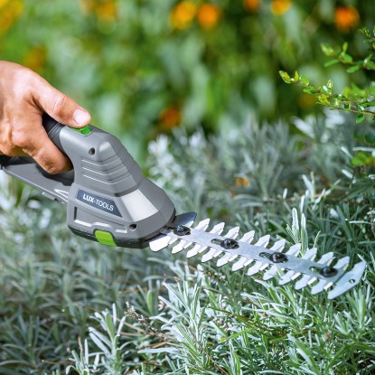 Aku nožnice na trávu a kríky LUX-TOOLS 1 PowerSystem A-GS-20/20 sú vhodné na hobby použitie, výhradne na zostrihávanie živých plotov, kríkov a krovia. Na presné rezanie sú nožnice vybavené protibežnými, obojstrannými rezacími nožmi s reznou dĺžkou 200 mm, reznou šírkou 100 mm a rýchlosťou kmitania 1200 kmitov/min. čo ich robí ideálnymi pre širokú škálu použitia. Pre pohodlnú prácu je možné rezacie ústrojenstvo vymeniť jednoducho a rýchlo bez použitia náradia. Navyše sú nožnice opatrené ergonomicky tvarovanou mäkčenou rukoväťou.