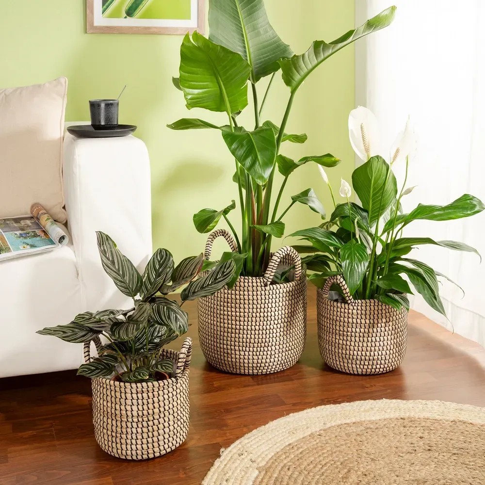 Každá nádoba je starostlivo ručne tkaná z morskej trávy. Vďaka malým odchýlkam v tvare a farbe je každý kus jedinečný. Obal je k dispozícii vo farbách Seagrass White (biela) a Seagrass Black (čierna) a ponúka všestranné možnosti vyzdobenia vášho domova. Rukoväte v príslušnej farbe kvetináča sú nielen štýlové, ale aj praktické. Obal je vybavený pevnou plastovou fóliou vo vnútri, vďaka ktorej je vodotesný.