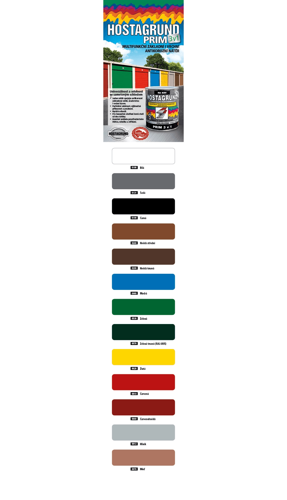 HOSTAGRUND 3v1 PRIM je jednovrstvová polomatná farba spájajúca vlastnosti základného antikorózneho náteru, medzivrstvy a vrchnej farby. Určená na priame nátery kovov v exteriéri aj interiéri. Farba je ideálna na nátery rozmanitých kovov, vrátane čerstvého pozinku, najmä na nátery striech, kovových konštrukcií, stožiarov, plotov, stĺpov, brán a pod. Farbu je po predchádzajúcej penetrácii podkladu možné použiť aj ako náter dreva alebo betónu.