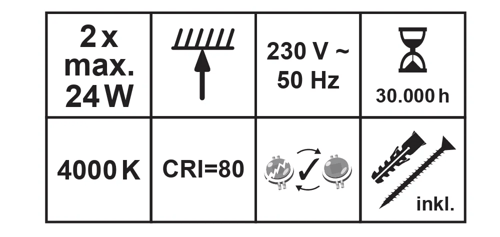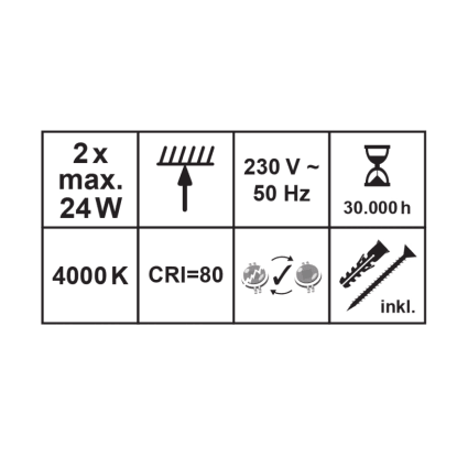 LED svietidlo do vlhkých priestorov s neutrálne bielym svetlom zaistí príjemné osvetlenie kúpeľne, pivnice alebo iných vlhkých priestorov. Vďaka stupňu krytia IP65 je svietidlo optimálne chránené pred striekajúcou vodou a prachom, a preto sa skvele hodí na použitie v náročnom prostredí. Vďaka robustnému krytu zo sivého skla a plastu je svietidlo obzvlášť odolné. S príkonom len 2x24 W a pôsobivou životnosťou 30 000 hodín je toto LED svietidlo energeticky úspornou voľbou. Svetelný zdroj je vymeniteľný.