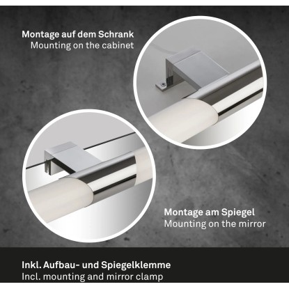 Brilo zrkadlové LED svietidlo Klak je vyrobené z bieleho plastu a chrómovaného kovu. Vďaka neutrálnemu bielemu svetlu (4000 K) navodí vo Vašej kúpeľni príjemnú atmosféru. Vstavaný LED panel svietidla má príkon 7 W a svetelný tok 800 lumenov. Vďaka stupňu krytia IP44 je možné stropné svietidlo bez problémov umiestniť do blízkosti umývadla alebo sprchy, pretože je chránené proti striekajúcej vode. Pre jednoduchú montáž sa navyše dodáva vrátane montážnej a zrkadlovej svorky, kedy môžete svietidlo priskrutkovať k Vašej skrinke alebo ho nasadiť na dosku zrkadla. Rozmery činia 5 x 32 x 12 cm (V x Š x H).