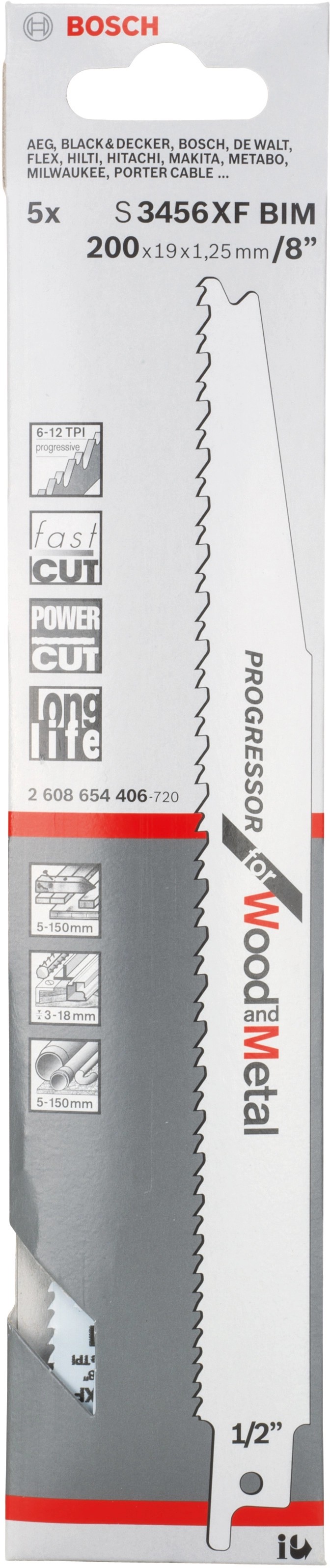 Pílový list Bosch S 3456 XF na drevo a kov umožňuje výkonné a rýchle rezy v hrubých aj tenkých materiáloch. Postupne sa zväčšujúci rozstup zubov umožňuje výkonné a rýchle rezy v materiáloch s rôznou hustotou, pričom zuby sú ideálne na rezanie rôznych druhov dreva a kovu vrátane hliníka. Stredná hrúbka steny (1,25 mm) tiež ponúka najlepšiu rovnováhu medzi rýchlosťou, flexibilitou a stabilitou pri rezaní. Bimetalový pílový list je tiež optimalizovaný na rezanie mäkkých klincov, mäkkej ocele a neželezných kovových komponentov v dreve. Má štandardnú dĺžku 200 mm, čo umožňuje reznú kapacitu až 150 mm.
