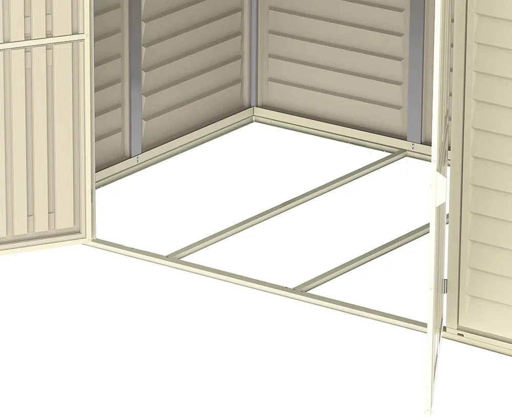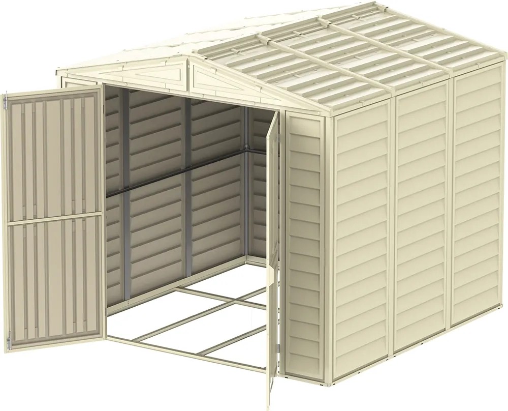 Plastové domčeky na náradie Duramax sa vyrábajú z bezúdržbového vinylu a pre maximálnu stabilitu majú oceľovú konštrukciu vystuženú oceľovými profilmi. Každý záhradný domček sa dodáva vrátane základňového rámu. Plastový záhradný domček Duramax DuraMate zaujme svojim moderným designom. Veľký dverný otvor s dvojitými dverami zaisťuje pohodlný vstup.