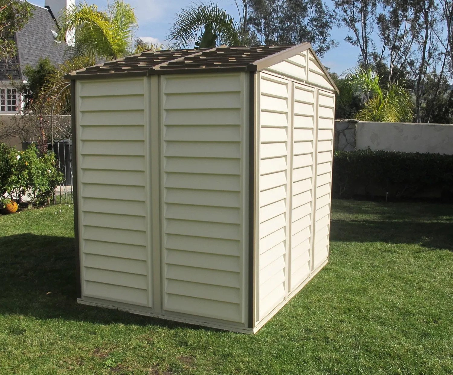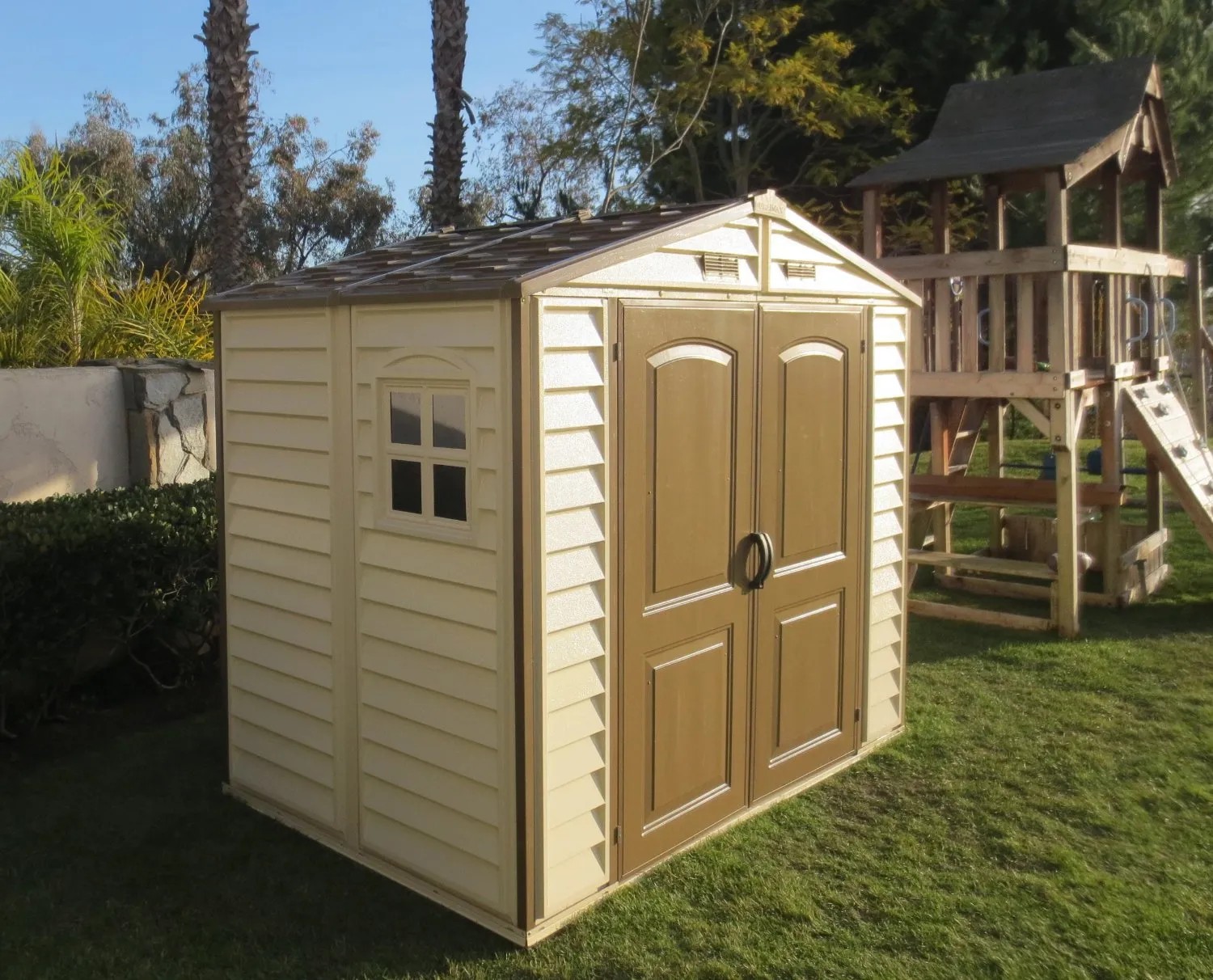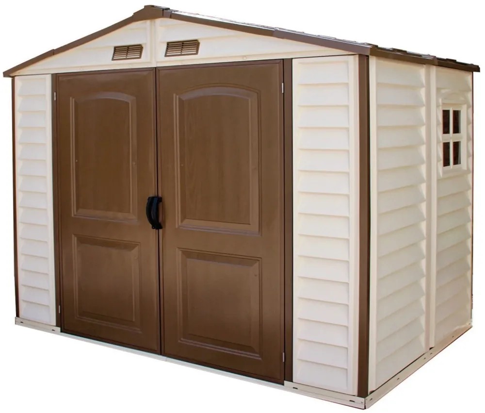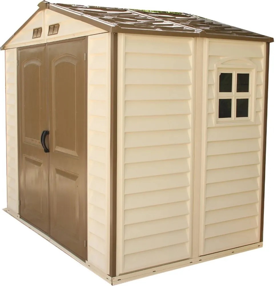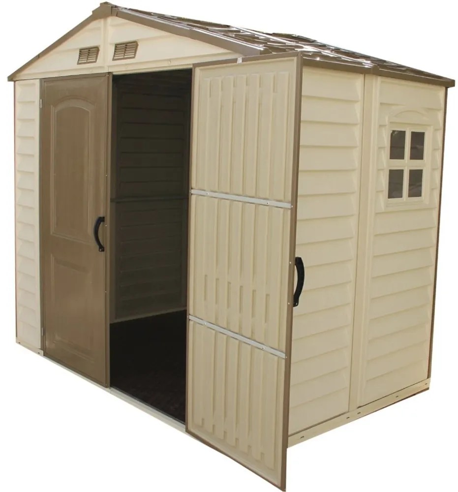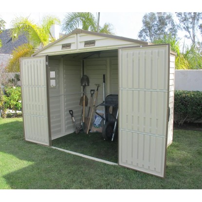 Plastové domčeky na náradie Duramax sa vyrábajú z bezúdržbového vinylu a pre maximálnu stabilitu majú oceľovú konštrukciu vystuženú oceľovými profilmi. Každý záhradný domček sa dodáva vrátane základňového rámu. Plastový záhradný domček Duramax StoreAll zaujme svojím moderným designom. Veľký dverný otvor s dvojitými dverami zaisťuje pohodlný vstup.