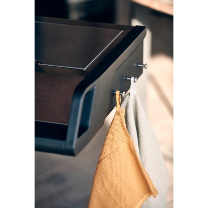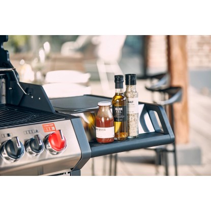 Na bočnej strane je gril vybavený plynovou platničkou na prípravu príloh. Plynovú platničku môžete zakryť a v zloženom stave použiť ako praktickú odkladaciu plochu.