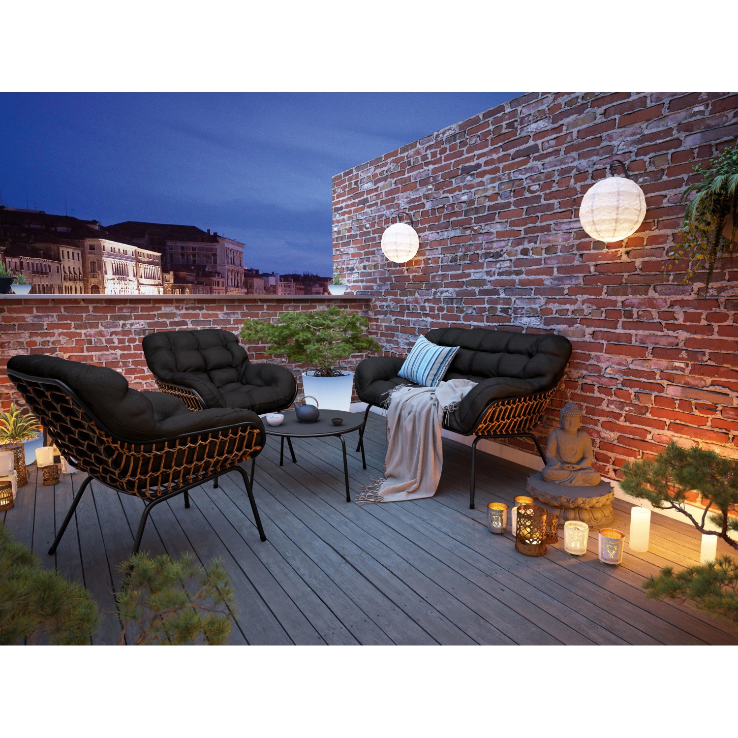 4dielna lounge zostava Cultana vám aj vašej rodine poskytne príjemné posedenie na záhrade alebo terase. Stabilná sedacia súprava zaujme svojim moderným dizajnom a vysokou kvalitou spracovania. Celkovo poskytuje dostatok miesta pre štyri osoby. Súprava tiež obsahuje okrúhly konferenčný stolík antracitovej farby, ktorý je možné ľubovoľne umiestniť. Je vybavený oceľovou stolnou doskou, ktorá presvedčí svojou robustnosťou a jednoduchou údržbou.