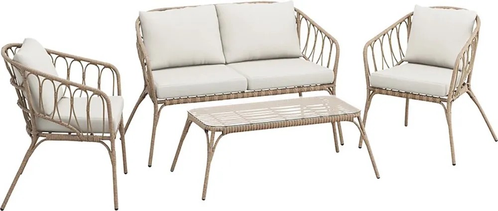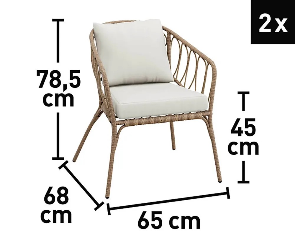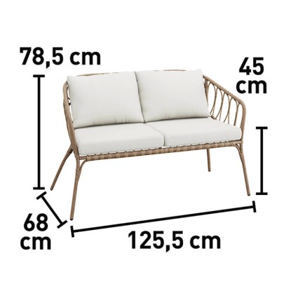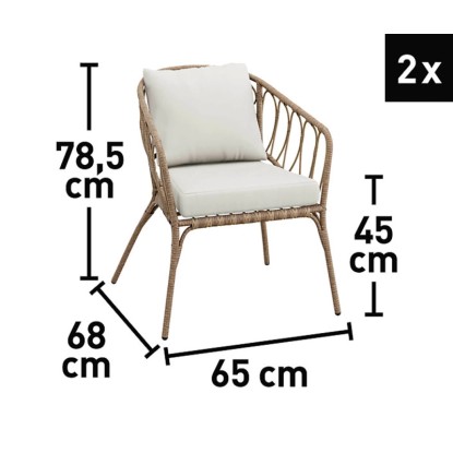 Záhradný nábytok má stabilnú oceľovú konštrukciu s dlhou životnosťou, ktorá zaisťuje stabilitu. Je potiahnutý prírodne pôsobiacim výpletom z polyratanu odolného voči poveternostným vplyvom s elegantným vzhľadom. Lounge nábytok zároveň presvedčí nízkou hmotnosťou. Navyše umožňujú nekomplikovanú manipuláciu. Kompletné vybavenie tvorí pohodlné podušky a chrbtové podušky. Sú opatrené odolnými poťahmi zo 100% polyesteru béžovej farby. Možno ich čistiť až na 30 °C. Ich výplň tvorí polypropylén a polyuretánová pena, ktorá je vysoko elastická.
