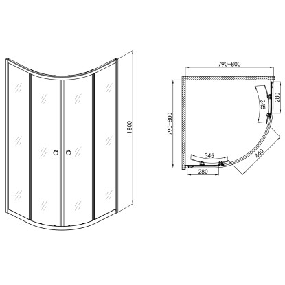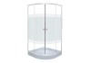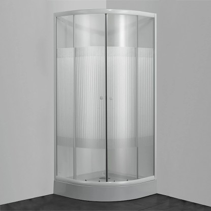 Štvrťkruhový sprchovací kút bez vaničky s bielymi profilmi s rozmermi 80 x 80 x 180 cm. Dvojité posuvné dvere z 4 mm hrubého bezpečnostného skla sú opatrené vodoodpudivou úpravou. Čiastočne pruhované dvere poskytujú súkromie. Dvere sú vybavené jednoduchými hornými a spodnými kolieskami. Radius: 55 cm.