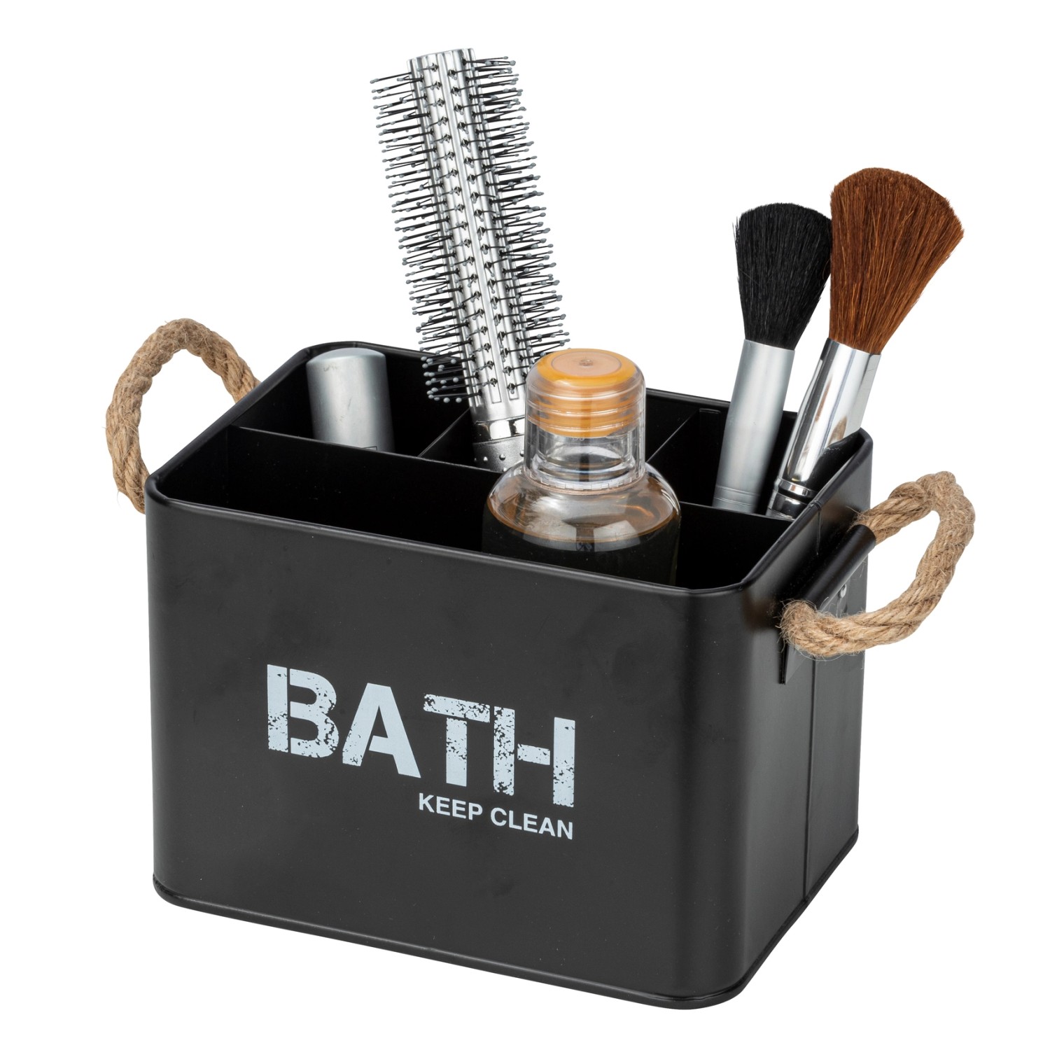 Trendový kúpeľňový box série Gara presviedča priemyselným štýlom s interiérovým dizajnom na najvyššej úrovni. Priemyselný dizajn kúpeľňového boxu Gara so štyrmi priehradkami v žiaduco peknej čiernej farbe prepožičia vašim priestorom výnimočnosť. Vďaka svojmu dizajnu s priamymi líniami, atraktívnemu nápisu a výraznej prítomnosti vytvára dekoratívny box z ocele s potlačou akcenty a dodáva kúpeľni harmonický faktor komfortu, ktorý pritiahne pozornosť vašich hostí. Pletené rukoväti so vzhľadom povrazu sú nielen praktické, ale sú aj plne trendové. Stabilný korpus z čiernej ocele vytvára požadovaný kontrast. V nápomocnom organizéri nájde mnoho kúpeľňových pomôcok svoje pevné miesto, či už ide o kefy na vlasy, sponky, kozmetiku a mnoho ďalších doplnkov. Odteraz máte pocit, že sú dobre uložené a vďaka úložným boxom Gara rýchlo vytvoríte poriadok. Šikovné rozdelenie do troch menších priehradiek a jednej väčšej priehradky sa postará o ešte väčší prehľad. Kúpeľňový box série Gara presvedčí mnohými rôznymi vyhotoveniami - jednoducho využite všetky farby a dizajny pre vaše individuálne odkladacie potreby a vkus.
