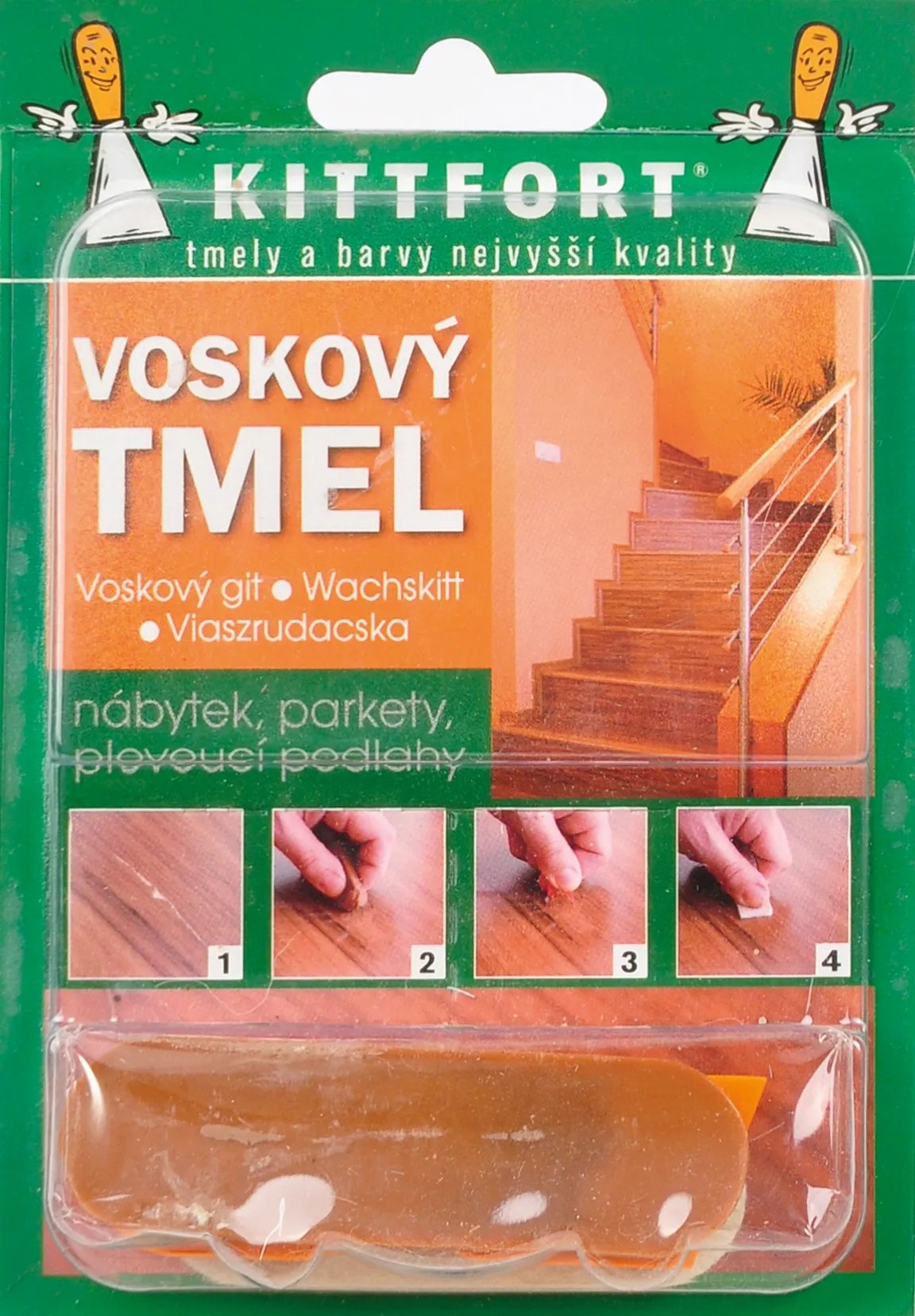 Voskový tmel slúži na opravu a retušovanie rýh a drobných škrabancov v plávajúcich podlahách, parketách, morenom dreve a leštenom nábytku. Tmel je po aplikácii svetlostály. Následné ošetrovanie opravených miest bežným spôsobom. Veľmi rýchla a jednoduchá oprava - interiér aj exteriér.