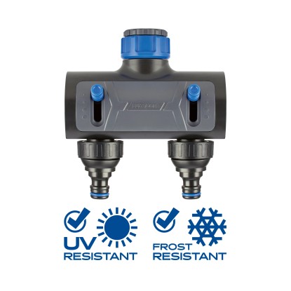 Rozdeľovač je vhodný pre vodovodnú prípojku o rozmere 26,4 mm (G 3/4). Obe prípojky pre hadice majú priemer 33,3 mm (G 1). Príslušné rýchlouzávery sú súčasťou systému. Hadicový rozdeľovač je vyrobený z kvalitného plastu. Vyznačuje sa odolnosťou voči UV žiareniu a mrazu.