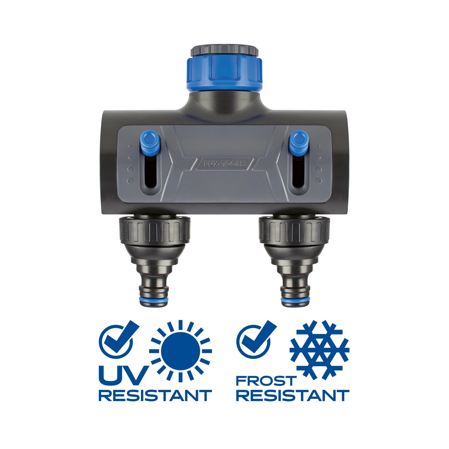 Praktickým dvojcestným rozdeľovačom značky LUX-TOOLS zároveň prepojíte dve záhradné hadice s prípojkou na vodu. Umožňuje zavlažovanie dvoch rôznych oblastí. Môžete tak súčasne prevádzkovať zavlažovač trávnika a záhradnú sprchu. Rozdeľovač vody je kompatibilný so všetkými bežnými nástrčnými hadicovými systémami. Má priame rozvetvenie smerom dole, ktoré je možné ovládať jednotlivo. Pritom môžete nastaviť požadované množstvo prietoku vody pre každú prípojku v štyroch stupňoch.