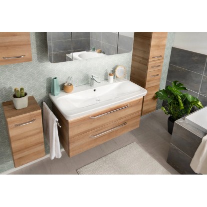 Séria kúpeľňového nábytku FACKELMANN MILANO zaujme svojim harmonickým, atraktívnym a vkusným dizajnom v príjemných a upokojujúcich farbách. Kúpeľňový nábytok série MILANO je k dispozícii v 3 farebných prevedeniach - biela vo vysokom lesku, sukatý dub a kombinácia biela vo vysokom lesku a sukatý dub. Korpusy skriniek majú matnú bielu farbu a priečky a zadné steny majú striebornosivú farbu. Všetok kúpeľňový nábytok série MILANO je možné jednoducho kombinovať podľa ľubovôle medzi sebou. Okrem kúpeľňového nábytku v tejto sérii nájdete aj umývadlá, doplnkové osvetlenie a zrkadlá.