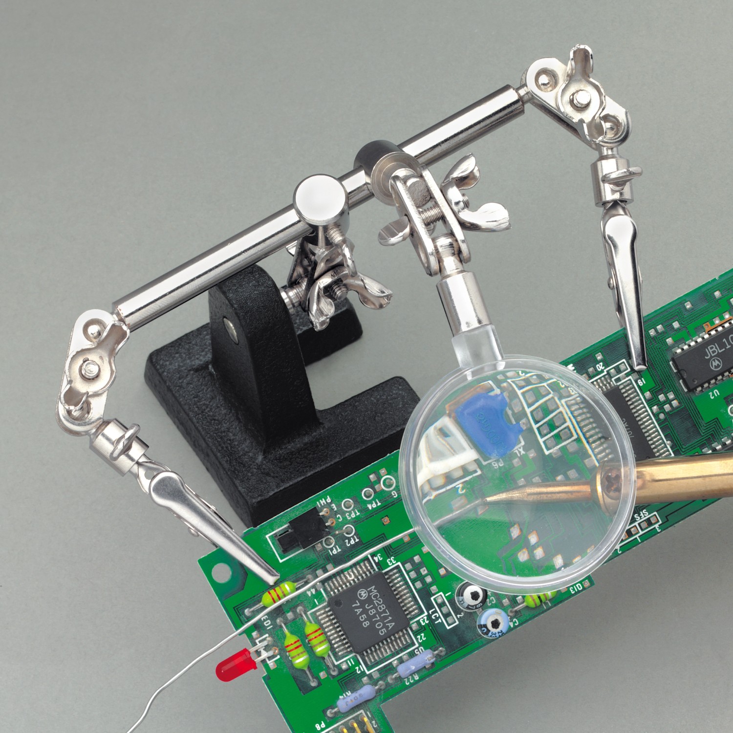 LUX-TOOLS tretia ruka s lupou je optimálnym pomocníkom pri akomkoľvek spájkovaní. Výrobok drží všetky diely a obrobky vo svojich 2 svorkách, čím uľahčuje spájanie. Tlakovo liata pätka zaisťuje optimálne stanie.