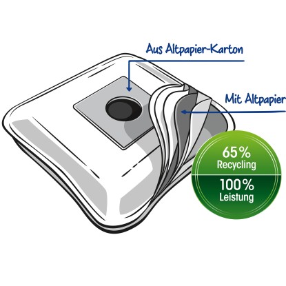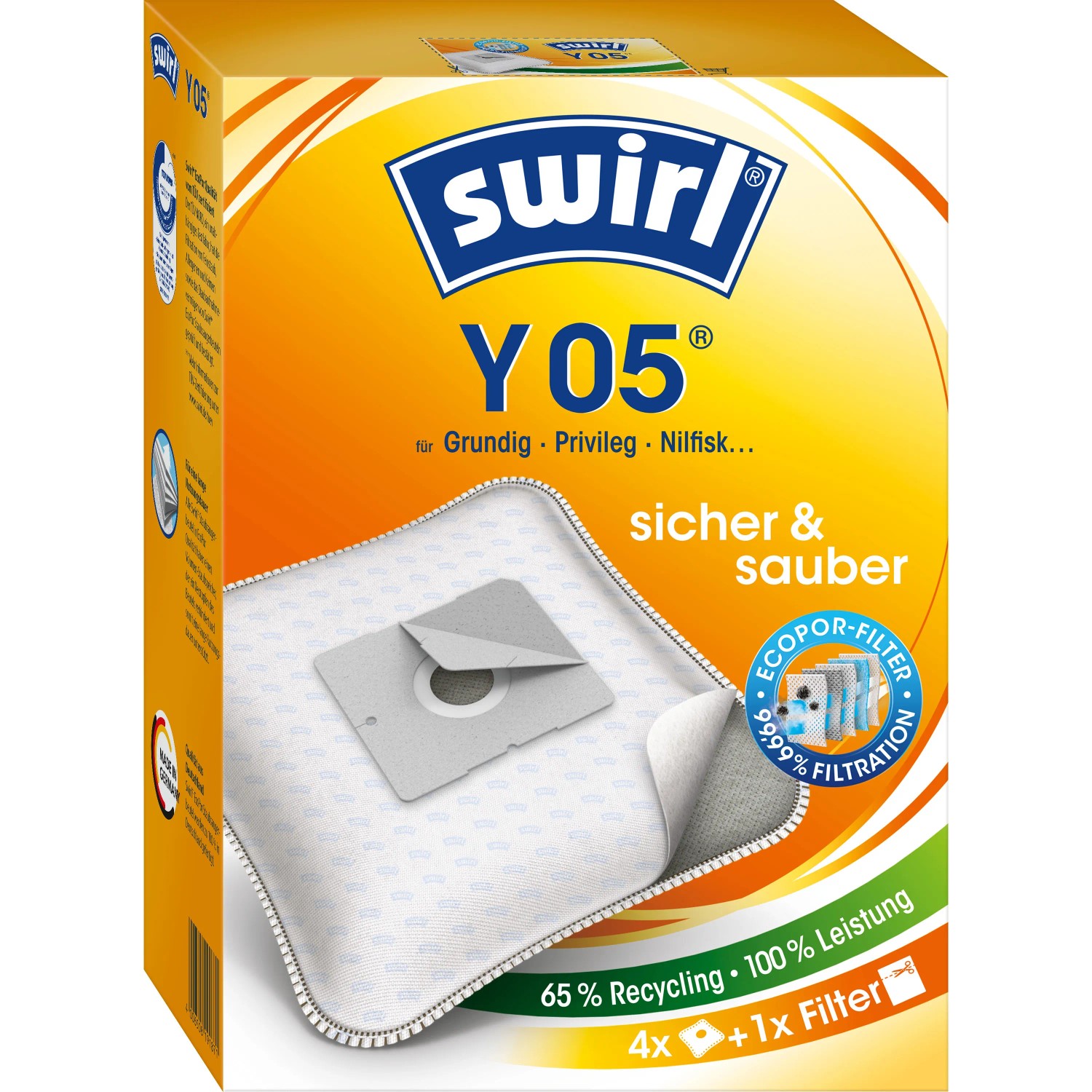 Vrecká do vysávača Swirl s filtrom EcoPor zaisťujú filtráciu 99,99% domáceho prachu a alergénneho jemného prachu, ako sú napríklad peľ, spóry plesní, výkaly roztočov. Vďaka prachovému uzáveru Dirtlock sa pri výmene vrecka nedostane žiadny prach späť do okolia. V závislosti od typu vrecka sa vrecká do vysávača skladajú zo 45-65 % z recyklovaného materiálu.