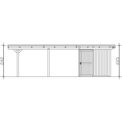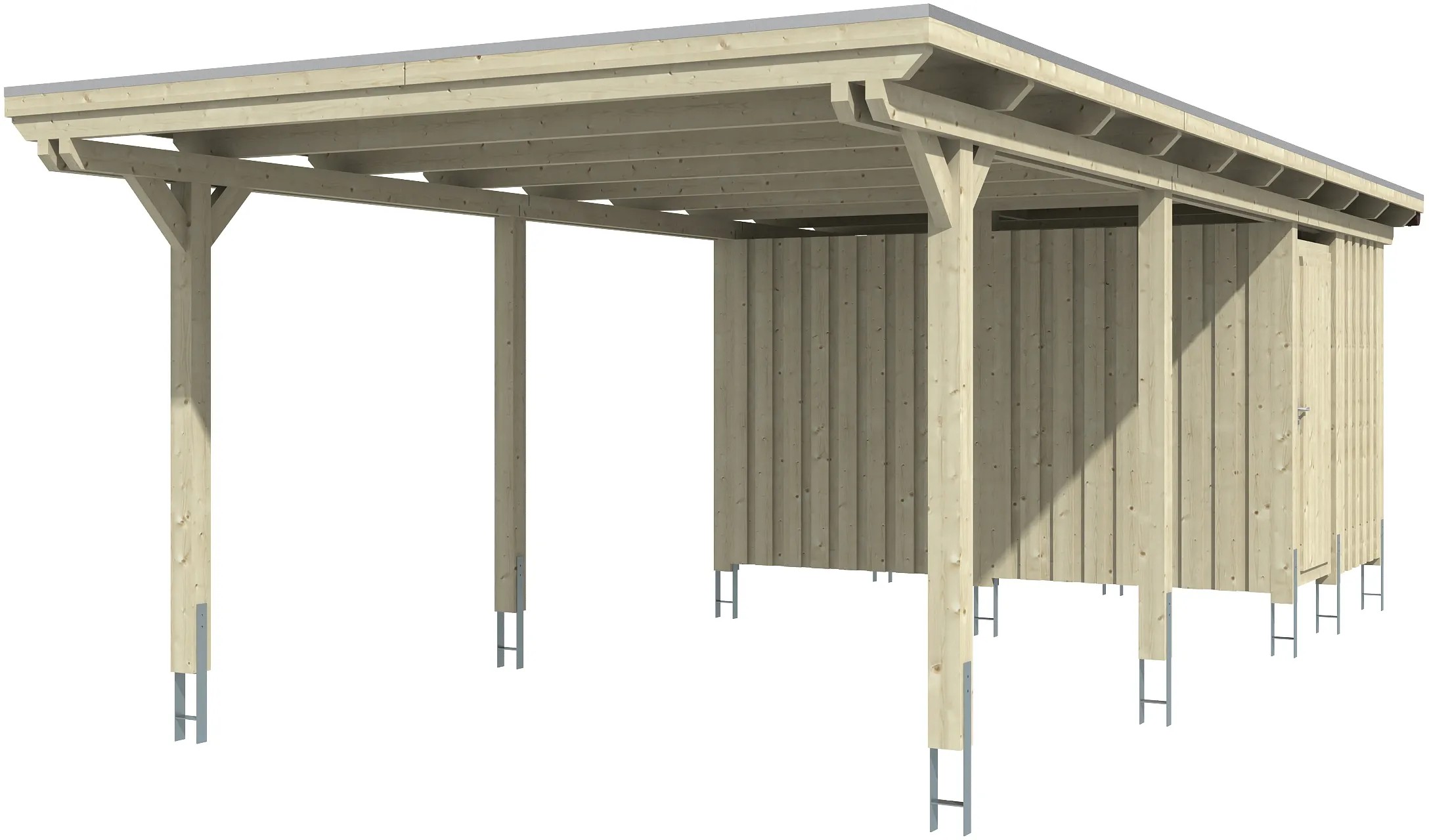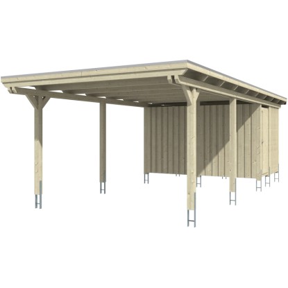 Prístrešky Skan Holz Emsland poskytujú vysoko kvalitnú ochranu proti poveternostným vplyvom a sú vyrobené zo škárovky (smrekových lepených trámov). Prístrešky na auto s plochou strechou Emsland majú 12 x 12 cm hrubé stĺpiky vrátane kotviacich pätiek v tvare H na zabetónovanie. Strecha je krytá hliníkovými panelmi s trapézovým profilom. Zakončenie strechy tvorí drevená lišta s hliníkovou zakončovacou hranou. Súčasťou dodávky je plastový odkvapový žľab s odkvapovým zvodom, montážny materiál a návod.
