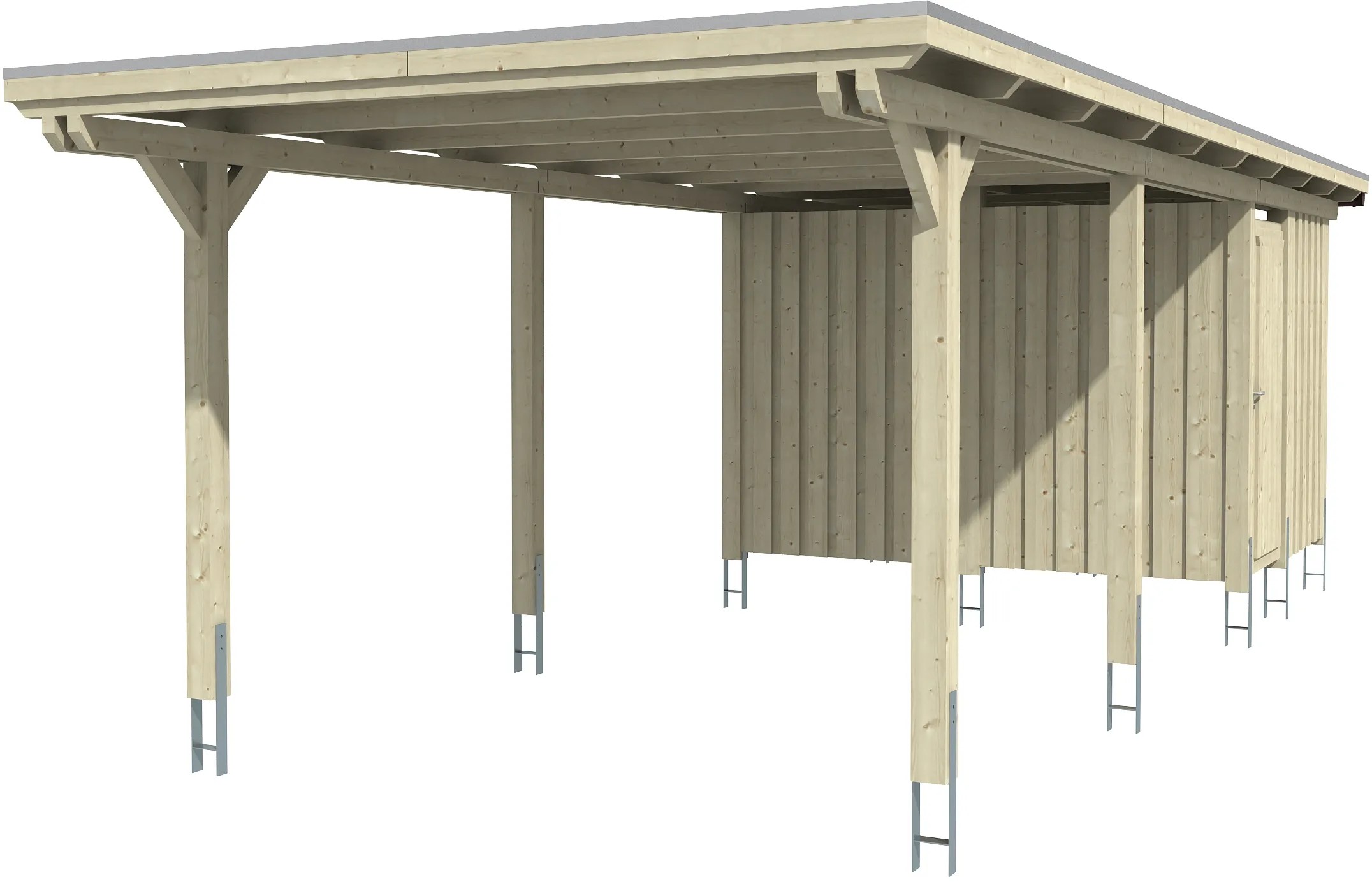 Prístrešky Skan Holz Emsland poskytujú vysoko kvalitnú ochranu proti poveternostným vplyvom a sú vyrobené zo škárovky (smrekových lepených trámov). Prístrešky s plochou strechou Emsland majú 12 x 12 cm hrubé stĺpiky vrátane kotviacich pätiek v tvare H na zabetónovanie. Strešná krytina je z 19 mm hrubého strešného obloženia s fóliou EPDM. Zakončenie strechy tvorí drevená lišta s hliníkovou zakončovacou hranou. Súčasťou dodávky je plastový odkvapový žľab s odkvapovým zvodom, montážny materiál a návod.