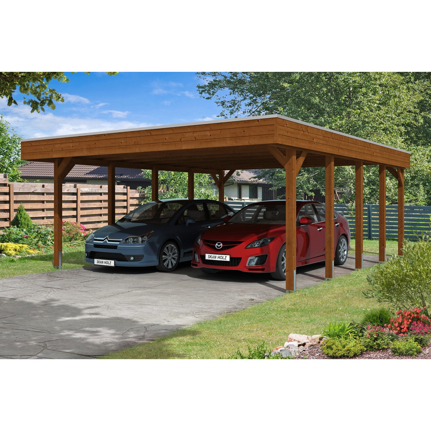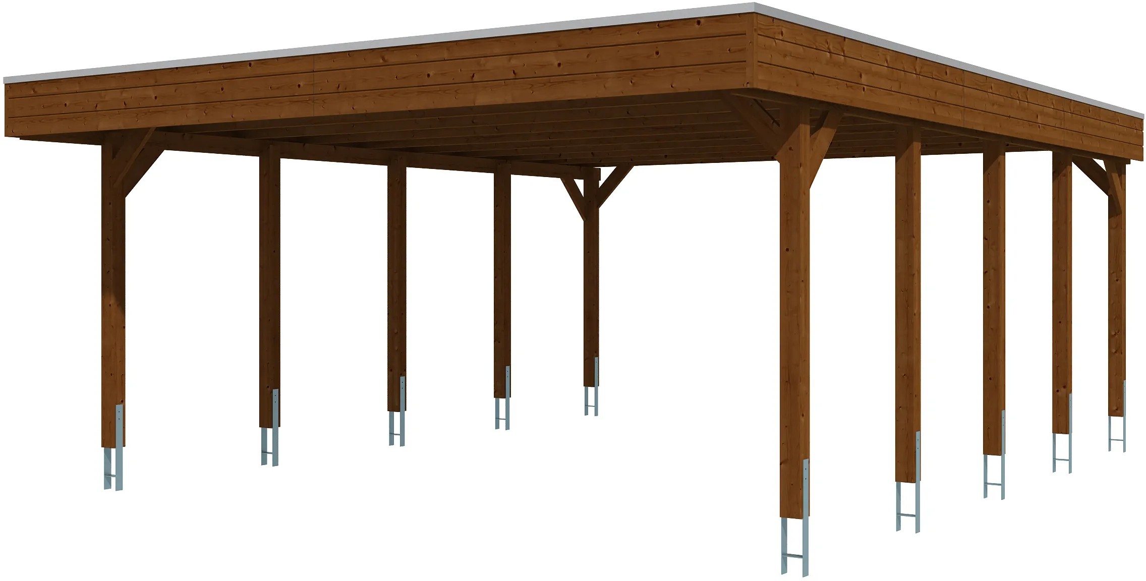 Prístrešky Skan Holz Friesland ako klasická ochrana proti poveternostným vplyvom pre vaše auto z impregnovaného dreva ihličnatého stromu. Prístrešky Friesland majú stĺpiky s rozmerom 11,5 x 11,5 cm vrátane kotviacich pätiek v tvare písmena H na zabetónovanie. Strecha je krytá hliníkovými panelmi s trapézovým profilom. Zakončenie strechy je z dreveného profilu s hliníkovou zakončovacou hranou. Spád je dozadu. Kompletné balenie s montážnym materiálom a montážnym návodom.