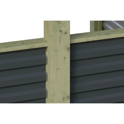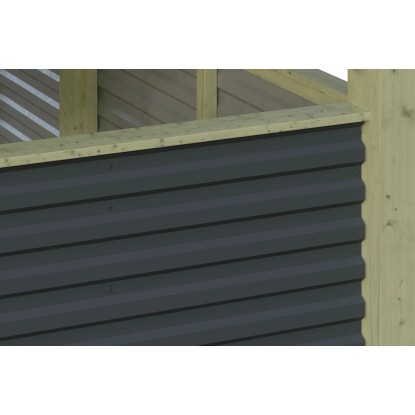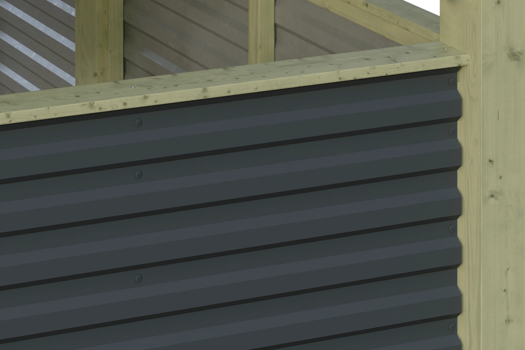 Steny sú vyrobené z hliníkových panelov s trapézovým profilom, ktoré dodávajú prístrešku moderný vzhľad. Zvonku sú opatrené farebným náterom, vo vnútri náterom vo farbe hliníka. Panely sú pripevnené k drevenej konštrukcii farebne zladenými klampiarskymi skrutkami.
