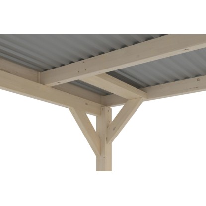 Prístrešky na auto Skan Holz Grunewald sú vyrobené z vysušeného smrekového dreva lepeného v niekoľkých vrstvách. Táto zmes je odolnejšia proti poveternostným vplyvom a je menej náchylná na praskanie ako prirodzené drevo. Stĺpiky prístrešku o rozmere 12 x 12 x 220 cm sú dodávané vrátane ukotvenia v tvare písmena H. 60 cm dlhé H-kotvy sú vyrobené z pozinkovanej plochej ocele na zabetónovanie do vlastného bodového základu. Kotvy pevne spájajú stĺpiky s podkladom a zaručujú vysokú stabilitu. Plochá strecha prístrešku je k dispozícii v dvoch variantoch - z hliníkových panelov (horná strana antracitová, spodná strana svetlo sivá) s trapézovým profilom (ALU) alebo s 19 mm strešným debnením s perodrážkou s dostatočným množstvom EPDM fólie. Strešná krytina z hliníkových panelov je nerozbitná a odolná proti krúpam, môže byť ale hlučná pri daždi. Je vysoko stabilná a tvarovo stála aj pri vysokých povrchových teplotách. Strecha je dodávaná s plastovými zvodmi.